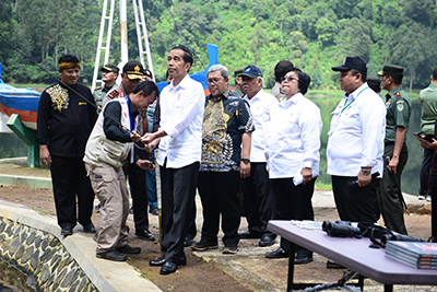 Bandung, Kementerian Lingkungan Hidup dan Kehutanan (KLHK), Kamis, 22 Februari 2018. Presiden RI Jokowi, Menteri Lingkungan Hidup dan Kehutanan Siti Nurbaya bersama masyarakat sekitar menanam 1.000 batang pohon untuk hijaukan hulu Citarum di Situ Cisanti, Desa Tarumajaya, Kecamatan Kertasari Kabupaten Bandung, Kamis (22/2/2018). Penanaman ini sebagai aksi nyata komitmen pemerintah dalam Restorasi Ekosistem Daerah Aliran Sungai (DAS) Citarum. Secara simbolis Presiden Jokowi menanam pohon Manglid (Manglietia glauca), dan Siti Nurbaya Damar (Agathis dammara).