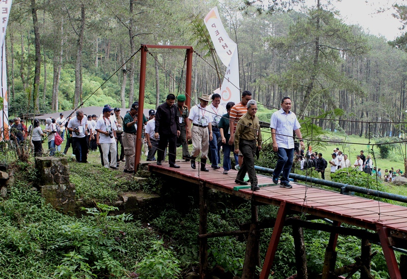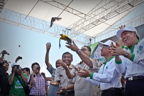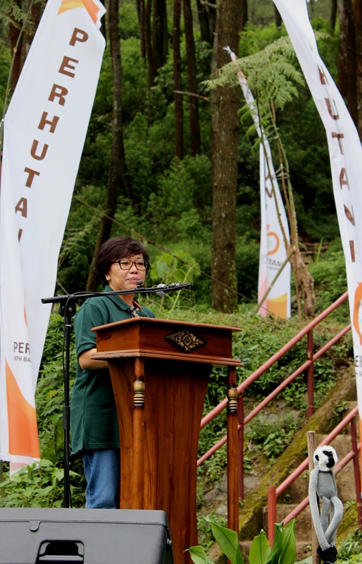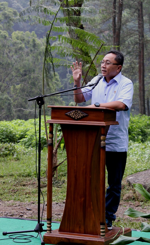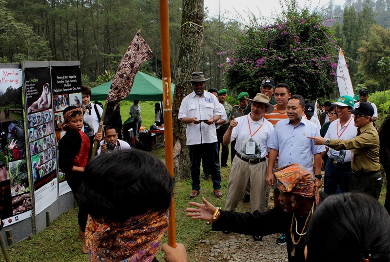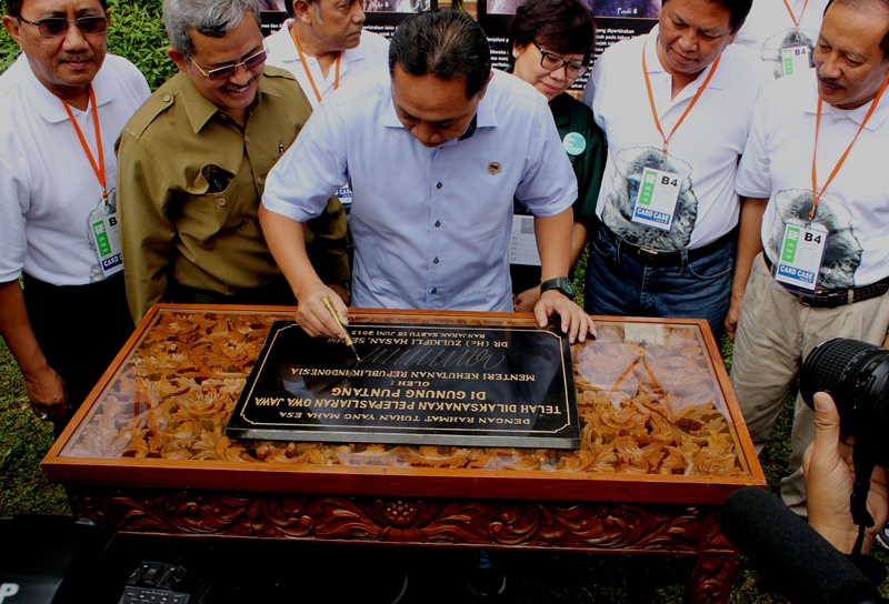 Pushumas Kemenhut, Bandung; Menteri Kehutanan Zulkifli Hasan didampingi Direktur Utama Perum Perhutani Bambang Sukmananto, melepasliarkan sepasang Owa Jawa (Hylobates moloch) di kawasan Hutan Lindung Gunung Malabar, Bandung, Jawa Barat pada tanggal 15 Juni 2013. Pelepasliaran ini dilakukan atas kerjasama Kementerian Kehutanan, Perum Perhutani dan Yayasan Owa Jawa.
