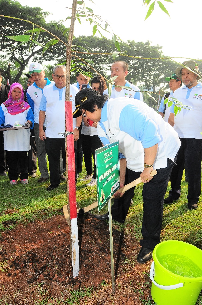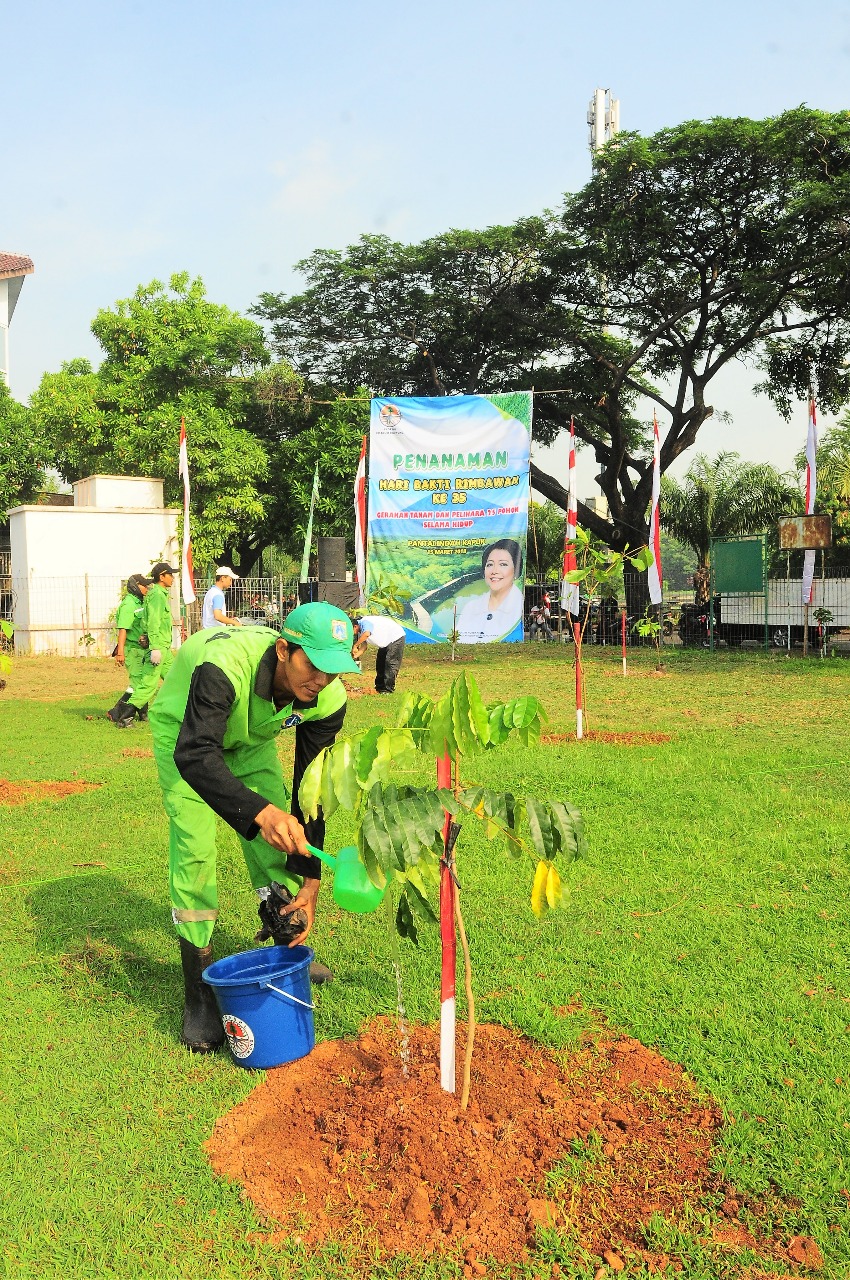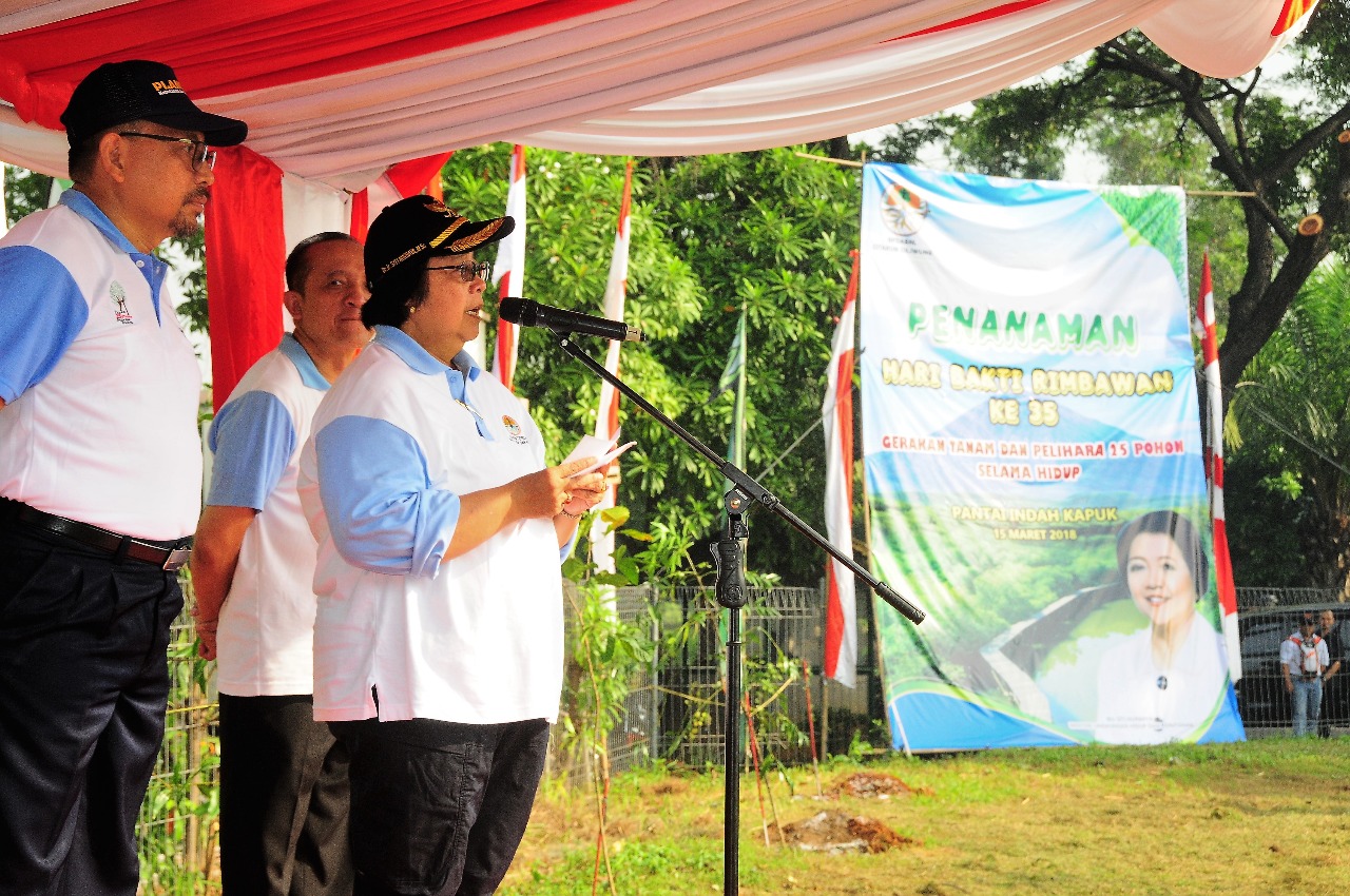 Dalam rangkaian Hari Bakti Rimbawan yang ke-35 Tahun 2018, KLHK melakukan kegiatan penanaman pohon pada lahan aset KLHK seluas 5.000 meter persegi di Perumahan Pantai Indah Kapuk, Jakarta, (15/03/2018). Pada kesempatan ini Menteri LHK Siti Nurbaya memimpin langsung kegiatan dengan menanam pohon Damar (Aghatis alba).