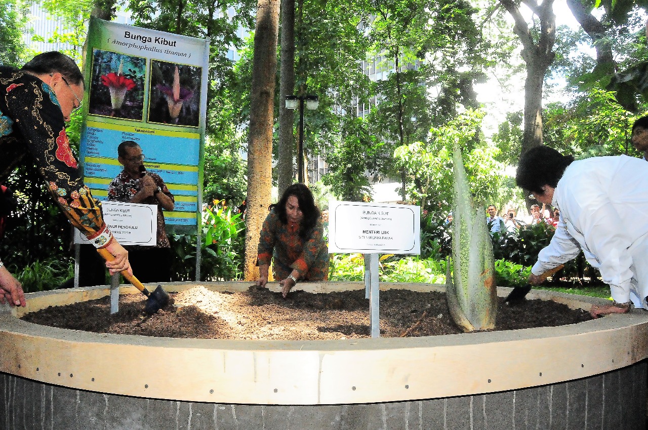 Sebagai refleksi komitmen upaya melestarikan keanekaragaman jenis tumbuhan dan satwa Indonesia, Menteri LHK, Siti Nurbaya, melakukan penanaman Bunga Kibut (Amorphophallus titanum) di Arboretum Ir. Lukito Daryadi, MSc. Gedung Manggala Wanabhakti, Jakarta (15/03/2018). Disampaikan Siti Nurbaya, penananam ini menjadi lebih penting lagi, mengingat tantangan cukup berat saat ini, dengan masih menguatnya tekanan dan ancaman yang menyebabkan terjadinya degradasi.