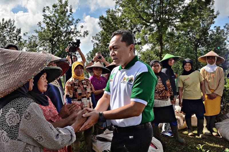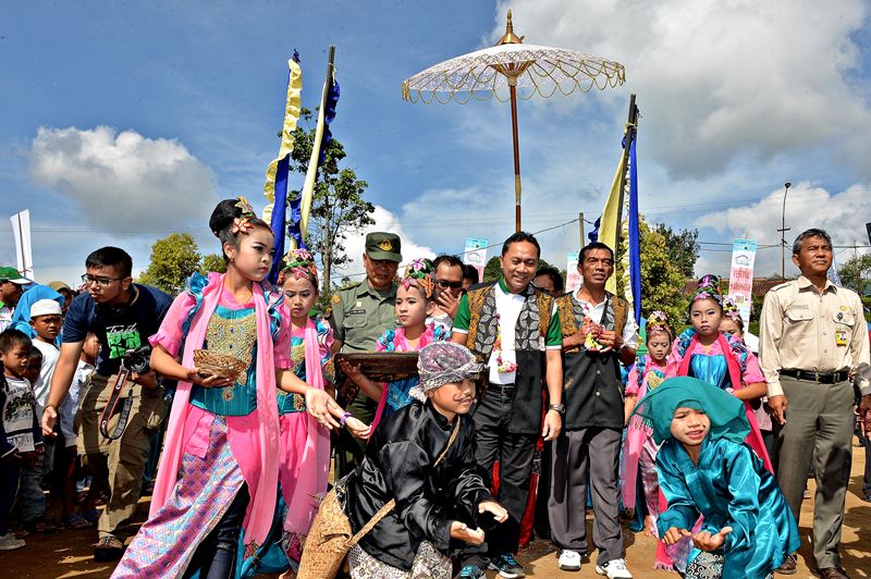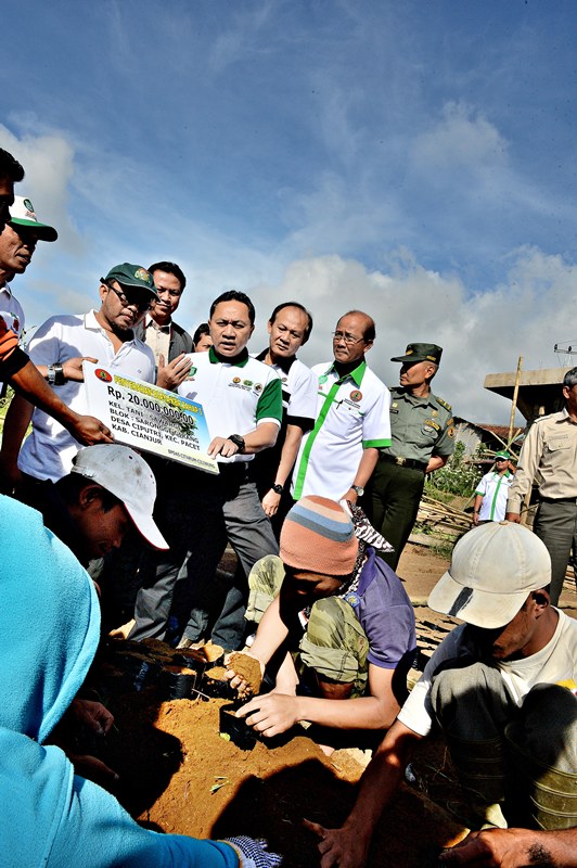 Pushumas Kemenhut, Cianjur : Menteri Kehutanan Zulkifli Hasan bersama Wakil Bupati Cianjur Dr. H. Suranto, MM dan Wakil Duta Besar Selandia Baru Ian Brownlie membuka acara pesta rakyat dan lsquo Festival Sarongge dengan memukul kentongan bambu, Sabtu (29/6) di Kampung Sarongge, Desa Ciputri, Kecamatan Cianjur. Turut hadir bersama Menhut Plt. Dirjen PHKA Sony Partono dan jajaran Kemenhut serta muspida setempat .