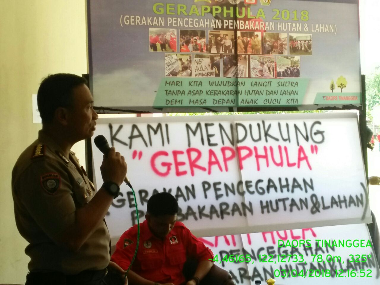 Sinergisitas dalam pengendalian kebakaran hutan dan lahan (karhutla) terus ditingkatkan oleh Pemerintah, sebagaimana yang dilakukan Brigade Pengendalian Kebakaran Hutan dan Lahan KLHK-Manggala Agni Daerah Operasional Tinanggea Sulawesi Tenggara bersama Polda Sulawesi Tenggara dalam kegiatan patroli udara, sosialisasi BINA KARUNA dan Kampanye Gerakan Pencegahan Pembakaran Hutan dan Lahan (GERAPPHULA) di Kecamatan Tinanggea, Kabupaten Konawe Selatan, Provinsi Sulawesi Tenggara (03/04/2018).