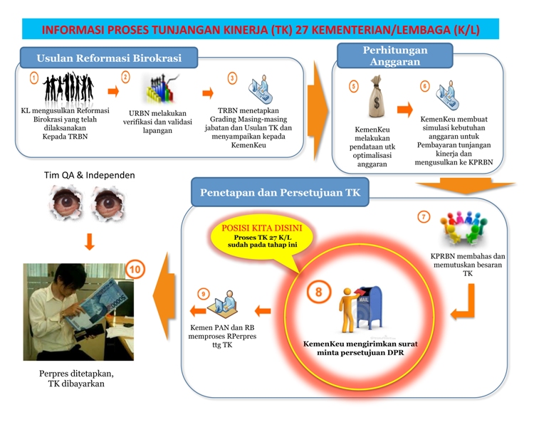 Setelah mendapat persetujuan Badan Anggaran DPR-RI, Kementerian PAN & RB memproses Rancangan Peraturan Presiden tentang Tunjangan Kinerja. Setelah Perpres ditetapkan, Tunjangan Kinerja dibayarkan.