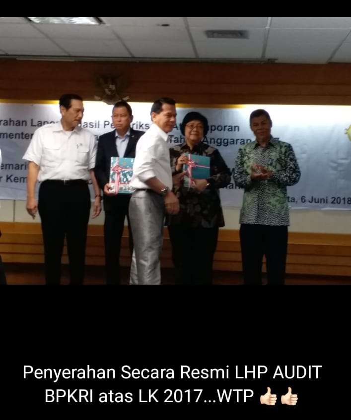 Laporan Keuangan Kementerian LHK Tahun 2017 memperoleh opini Wajar Tanpa Pengecualian (WTP), berdasarkan Laporan Hasil Pemeriksaan (LHP) Badan Pemeriksa Keuangan (BPK) RI.