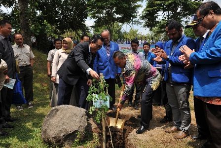 Menhut mengakhiri kunjungannya ke UII dengan melakukan penanaman bibit pohon trembesi didampingi rektor UII, Prof. Dr. Edy Suandi Hamid, M.Ec (Foto Pushumas: Set/rd)