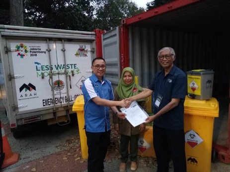 Koordinasi telah dilakukan dengan melibatkan Indonesia Asian Games 2018 Organizing Committee (INASGOC), Jasa Pengelola Limbah B3, dan Dinas Lingkungan Hidup Provinsi DKI Jakarta. Hasil koordinasi menyepakati bahwa KLHK bersama Jasa Pengelola Limbah B3 akan menyediakan perlengkapan untuk penanganan limbah medis berupa 15 (lima belas) unit Wheel Bin ukuran 240 liter, 100 (seratus) unit Infectious Bin, 650 (enam ratus lima puluh) unit safety box, Plastik kuning kemasan limbah medis, 5 (lima) unit coolbox ukuran 125 liter, 4 (empat) unit drop box untuk limbah B3 non medis yaitu electronic waste dan 1 (satu) unit cold storage.