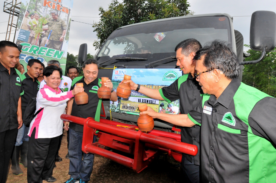 Foto 2. Ibu Erna Witular, Menteri Kehutanan, Mayjen TNI Doni Monardo dan Dirut BNI me-launching secara simbolis 2 juta bibit yang akan didistribusikan ke seluruh Indonesia dengan menggunakan truck.