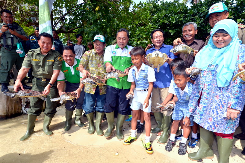 4 & 5 . Menhut melakukan pelepasan penyu bersama denganmasyarakat Kep. Seribu.