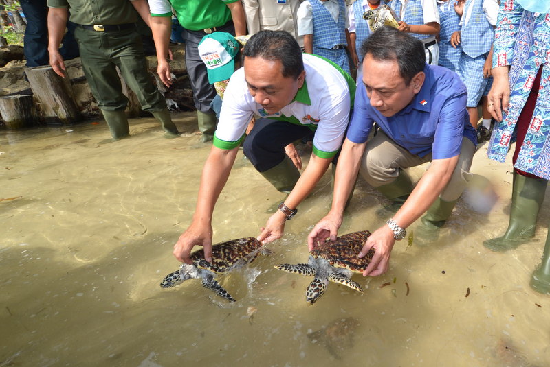 Pada akhir kunjungannya Menhut melakukan penanaman Mangrove di pantai Pulau Pramuka dan melakukan pelepasan penyu bersama dengan masyarakat Kep. Seribu. (FOTOPUSHUMAS/galih/arset)