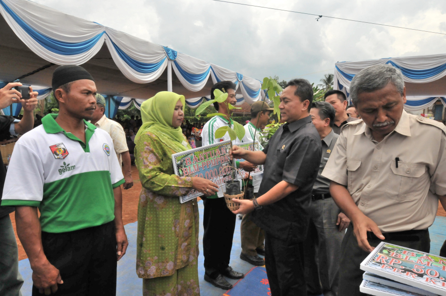 Caption Foto 2. Menteri Kehutanan menyerahkan bantuan langsung masyarakat kepada kelompok wanita tani di Desa Sindang Agung, Kec. Tanjungraja Kab. Lampung Utara.
