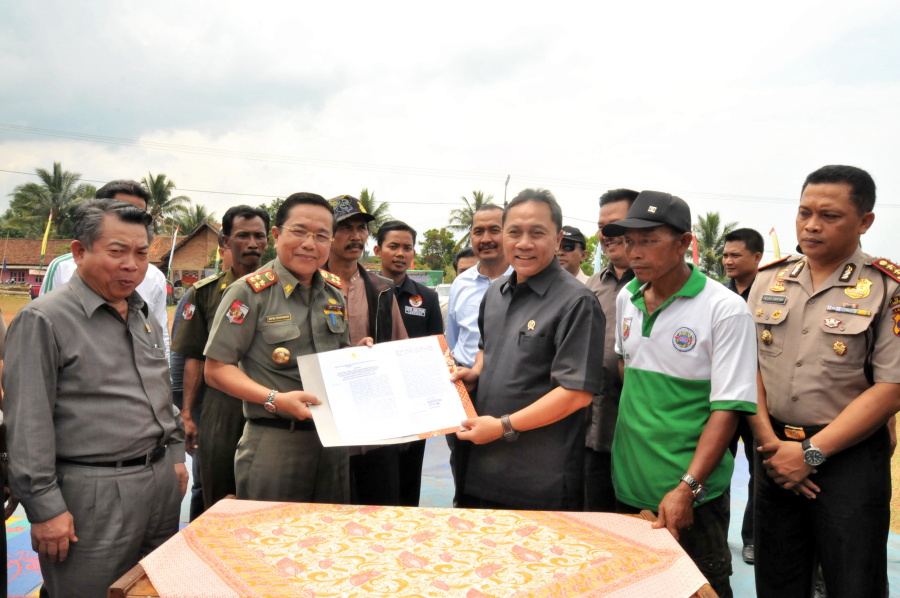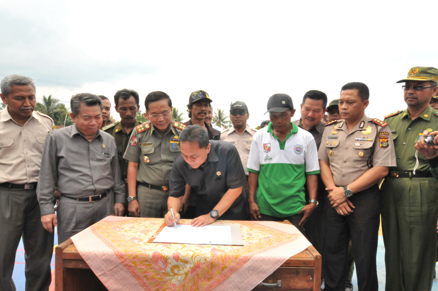 Caption Foto 3. Menteri Kehutanan menandatangani Surat Keputusan Penetapan Areal Kerja Hutan Kemasyarakatan (PAK HKm) disaksikan Sekda Kab. Lampung Utara, Rifki Wirawan, dan tokoh masyarakat Lampung Utara serta ketua kelompok tani di Sindang Agung, Tanjungraja, Lampura.