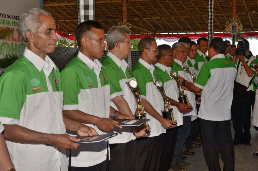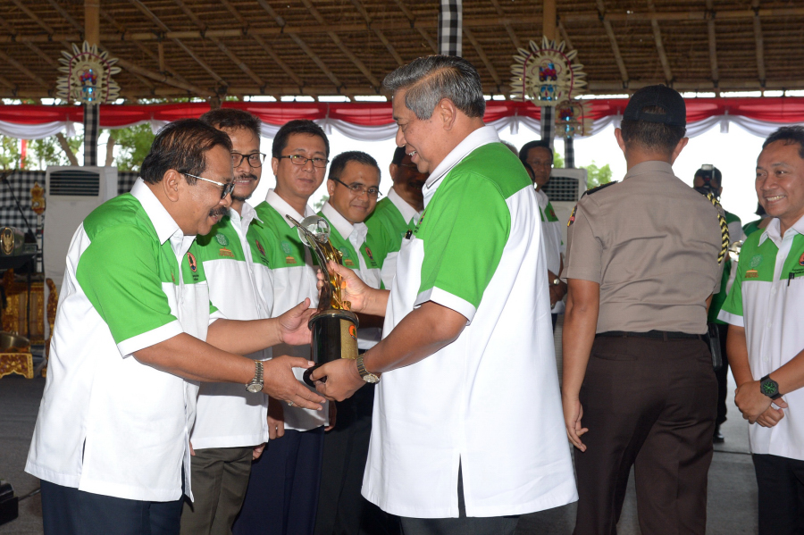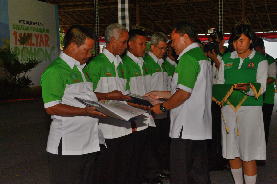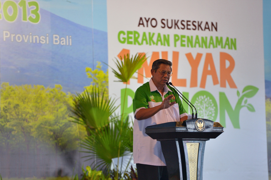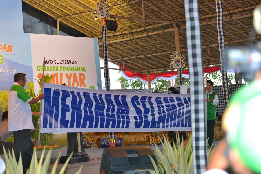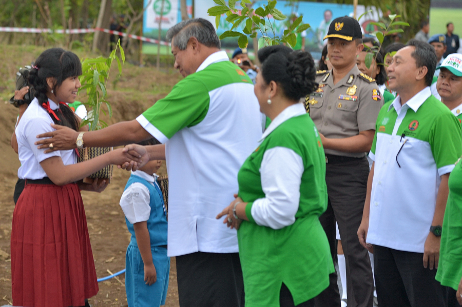 Pushumas Kemenhut, Karang Asem Bali : Presiden RI Susilo Bambang Yudhoyono , Ibu Ani Yudhoyono dan Menteri Kehutanan Zulkifli Hasan serta para Menteri Kabinet Indonesia Bersatu II serta para pejabat tinggi negara dan duta besar negara sahabat menghadiri Puncak Peringatan Hari Menanam Pohon Indonesia (HMPI) dan Bulan Menanam Nasional (BMN), Senin (25/11) di Banjar Tegal Langlangan Desa Datah, Kec. Abang, Kab. Karangasem, Provinsi Bali.