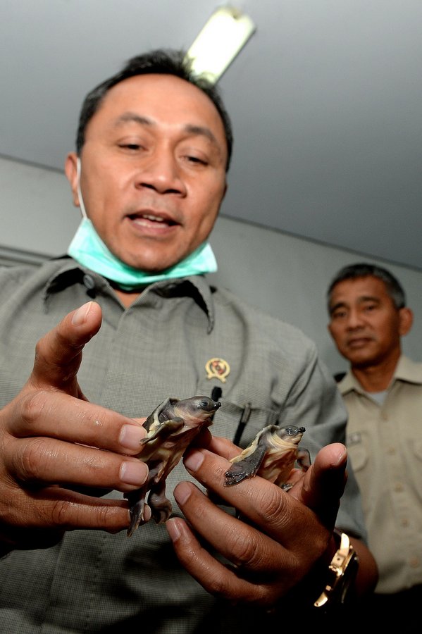 Pushumas Kemenhut, Jakarta : Menteri Kehutanan Zulkifli Hasan meninjau 2800 Kura Kura Moncong Babi (Carettochelis insclupta) hasil selundupan yang berhasil disita oleh petugas Polhut Seksi Konservasi Wilayah II Balai KSDA DKI Jakarta dan Petugas Karantina Ikan Badan Karantina Pertanian (Barantan) , Kamis (9/1) di Instalasi Karantina Hewan Balai Besar Karantina Pertanian Soekarno Hatta.