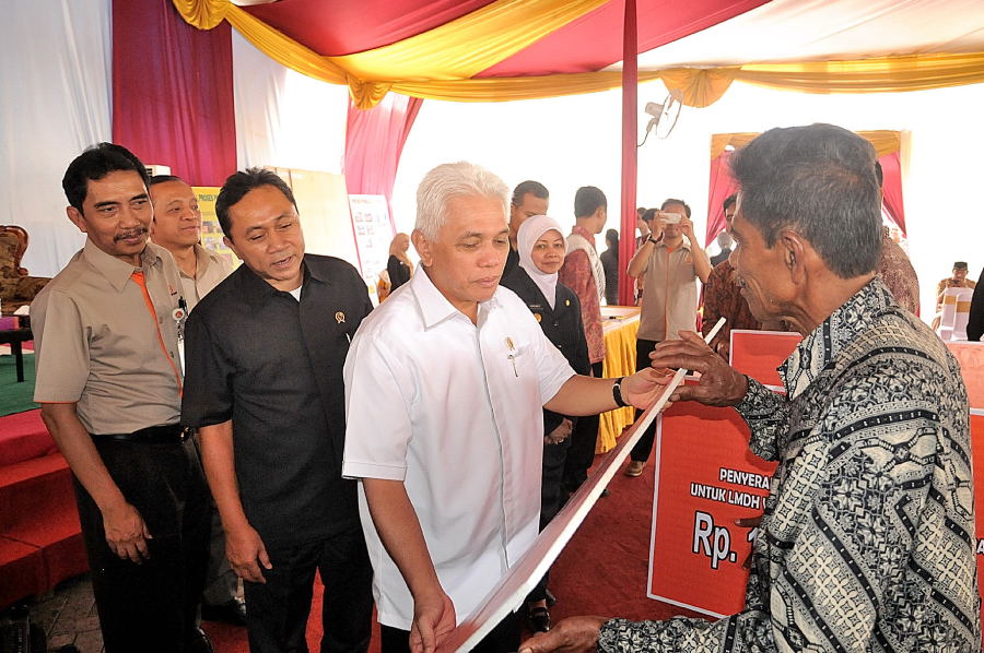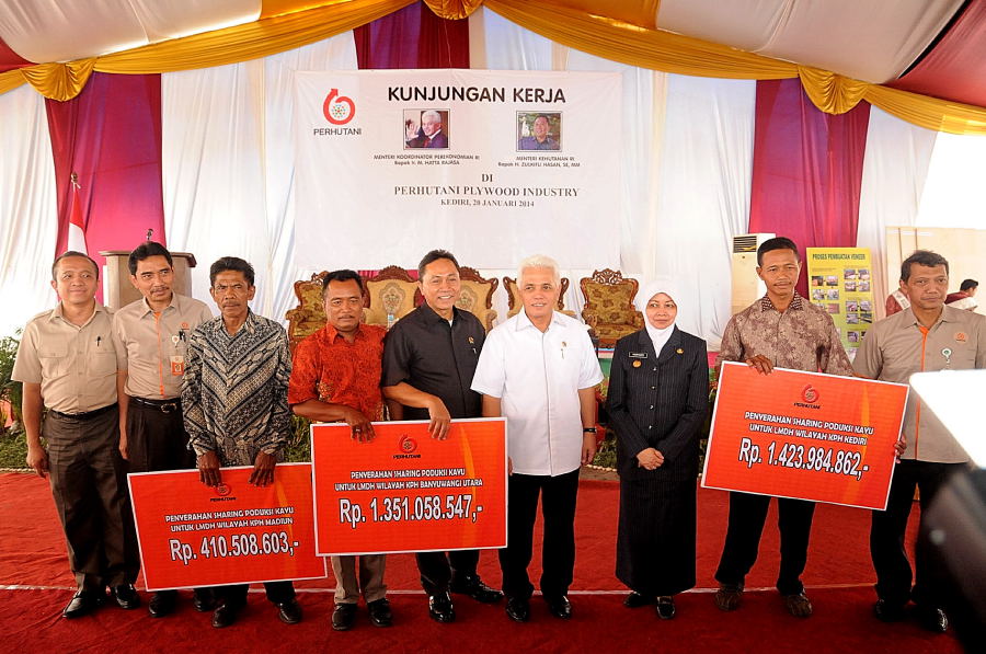 Dalam kesempatan tersebut Menko Perekonomian Hatta Rajasa didampingi Menteri Kehutanan Zulkifli Hasan menyerahkan dana sharing produksi kayu untuk Lembaga Masyarakat Desa Hutan (LMDH) wilayah KPH Kediri, Madiun dan Banyuwangi Utara. (FOTOPUSHUMAS/aminmadani/andika/arset)