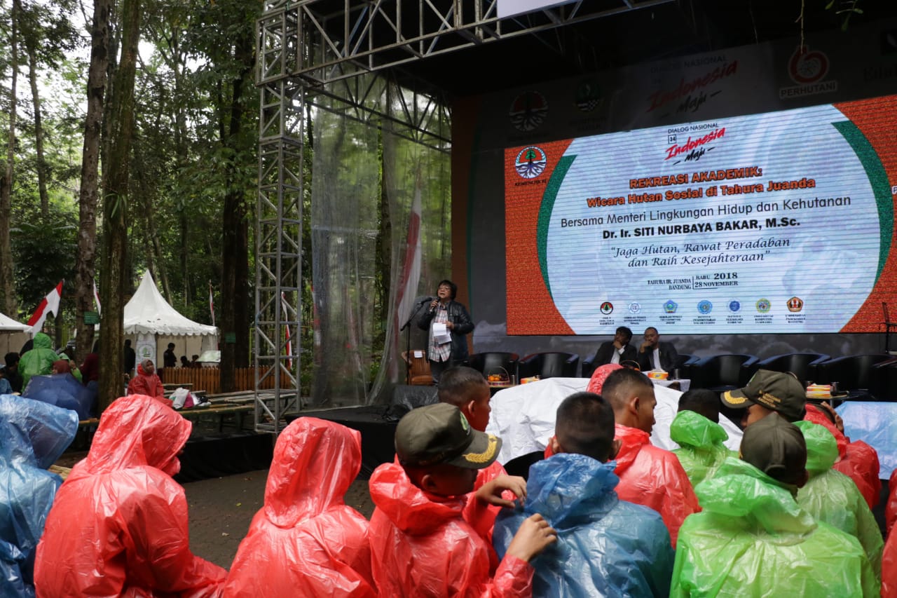 Jakarta, Kementerian Lingkungan Hidup dan Kehutanan (KLHK), Rabu, 28 November 2018. Sebagai upaya untuk menyampaikan hasil yang telah dicapai dalam mengembangkan Perhutanan Sosial, KLHK melakukan sinergi dengan perguruan tinggi yang dikemas dalam bentuk talkshow dengan mahasiswa se-Bandung Raya. Acara tersebut bertajuk Rekreasi Akademis : Wicara Hutan Sosial di Tahura Juanda ; Jaga Hutan, Rawat Peradaban, dan Raih Kesejahteraan yang dihadiri oleh mahasiswa dari Perguruan Tinggi UNPAD, STKS, IPDN, STIH ITB, STTD, UNIKOM dan siswa SMK Kehutanan. Acara dibuka oleh Menteri Lingkungan Hidup dan Kehutanan (LHK) Siti Nurbaya pada hari Rabu, 28 November 2018 di Taman Hutan Raya (Tahura) Ir. H. Djuanda, Bandung. Narasumber dalam talkshow tersebut berasal dari KLHK, Perguruan Tinggi dan Perum Perhutani.