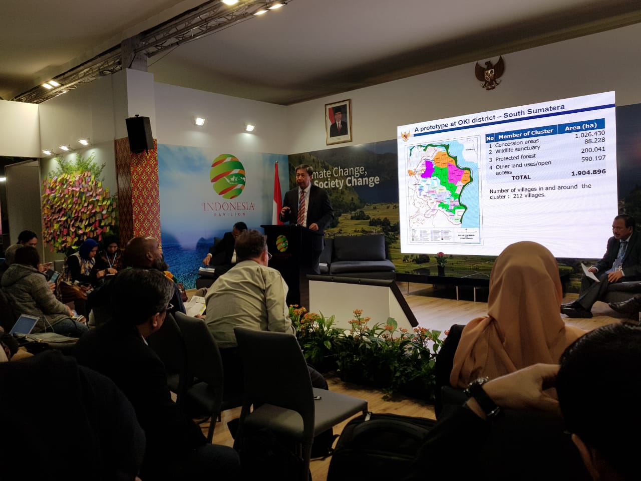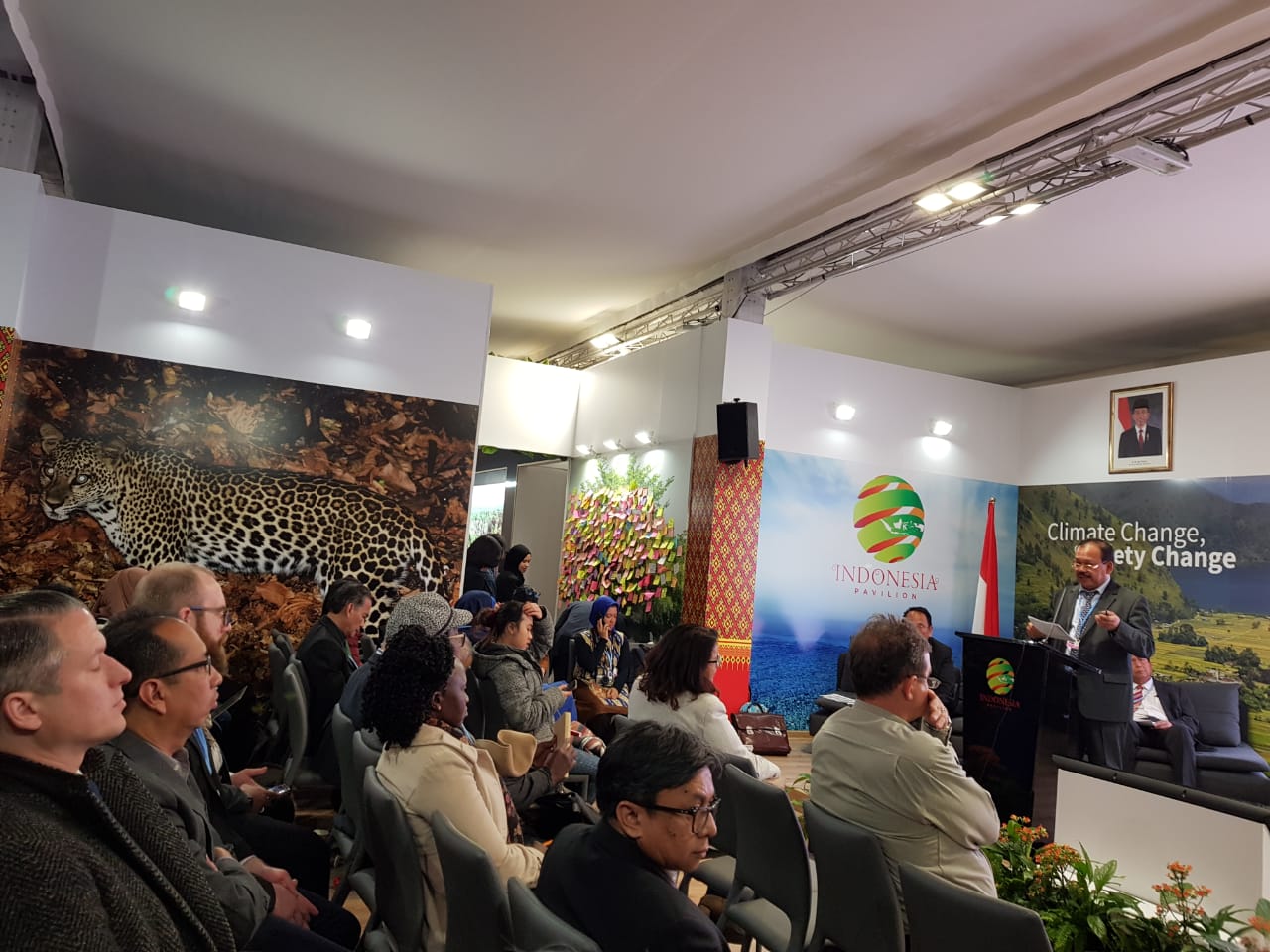 Penanganan kebakaran hutan dan lahan di Indonesia menjadi salah satu agenda dalam Talkshow yang diselenggarakan Paviliun Indonesia pada COP 24 UNFCCC di Katowice, Polandia (10/12). Mengangkat tema Development of Forest and Land Fire Prevention in Indonesia, talkshow menghadirkan tiga narsumber, Direktur Pengendalian Kebakaran Hutan dan Lahan KLHK, Asisten Deputi Tata Kelola Kehutanan, Kementerian Koordinator bidang Perekonomian, dan Direktur Sustainability and Stakeholder Engagement Asia Pulp and Paper.