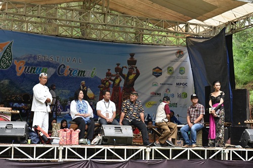Kuningan, Kementerian Lingkungan Hidup dan Kehutanan (KLHK). Senin, 24 Desember 2018. Perpaduan elemen seni, terasa di Festival Gunung Ciremai 2018 yang digelar di Bumi Perkemahan Palutungan dan Bumi Perkemahan Ipukan, Kabupaten Kuningan, Provinsi Jawa Barat (23/12). Dalam festival ini yang berlangsung selama dua hari ini, sinergitas multi pihak kaki Gunung Ciremai bersatu. Pemerintah Daerah Kabupaten Kuningan, Pemerintah Kabupaten Majalengka, Mitra Pengelola Gunung Ciremai, Seniman, Budayawan, Aktivis Lingkungan dan Dandim Kuningan, hadir mewarnai Bumi Perkemahan Palutungan.