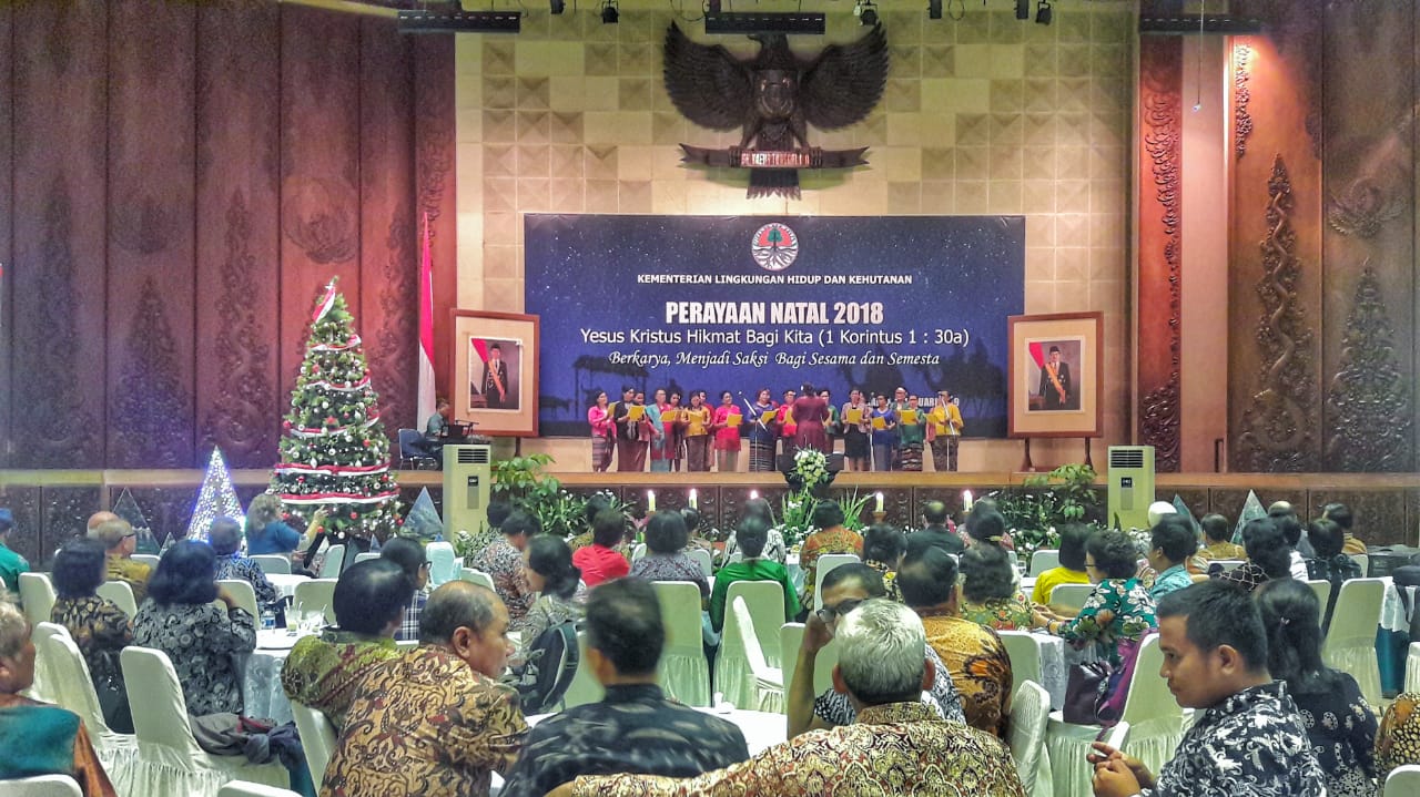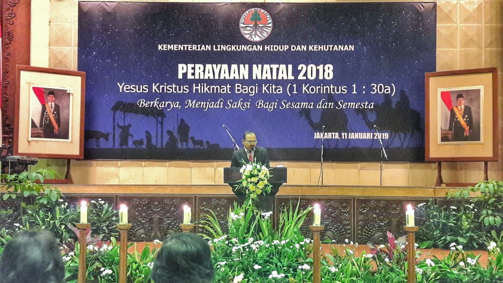 Jakarta, Kementerian Lingkungan Hidup dan Kehutanan (KLHK), Jumat, 11 Januari 2019. Momen peringatan Natal 2018 dimaknai sebagai pendorong semangat bekerja dan berkarya bagi seluruh karyawan-karyawati Kristiani Lingkup KLHK. Peringatan Natal 2018 lingkup KLHK ini diselenggarakan di Auditorium Soedjarwo Gedung Manggala Wanabakti, Jakarta (11/01/2018).