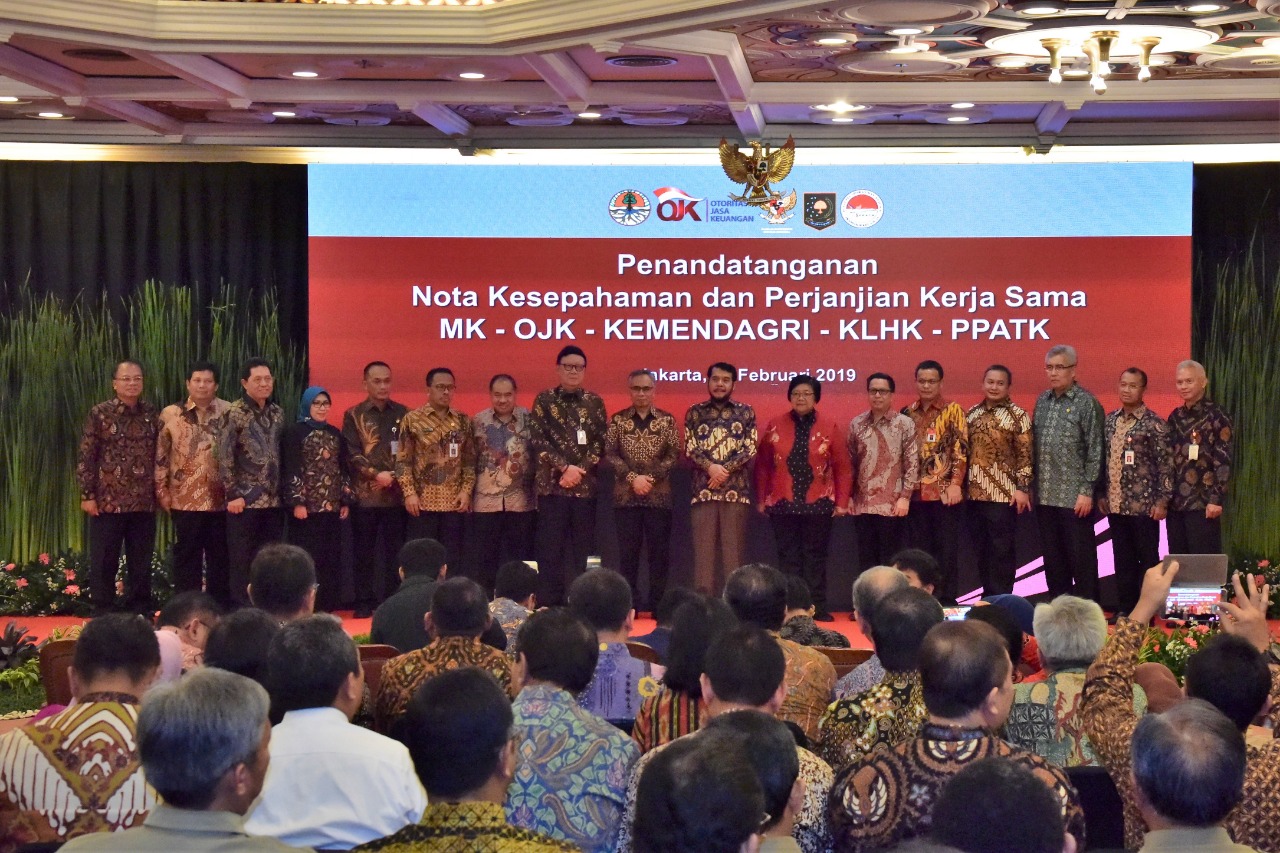 Jakarta, Kementerian Lingkungan Hidup dan Kehutanan (KLHK), Selasa, 19 Februari 2019. Upaya penegakan hukum Lingkungan Hidup dan Kehutanan (LHK) dan program perhutanan sosial semakin mendapat dukungan kuat dengan ditandatanganinya Nota Kesepahaman (MoU) antara Menteri LHK, Siti Nurbaya dan Menteri Dalam Negeri, Tjahyo Kumolo dan tiga Institusi lain yaitu Mahkamah Konstitusi (MK), Otoritas Jasa Keuangan (OJK) dan Pusat Pelaporan dan Analisis Transaksi Keuangan (PPATK) di Gedung Bank Indonesia, Jakarta (19/02/2019).