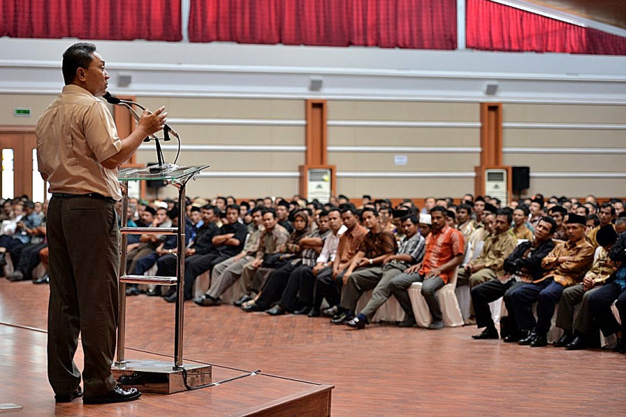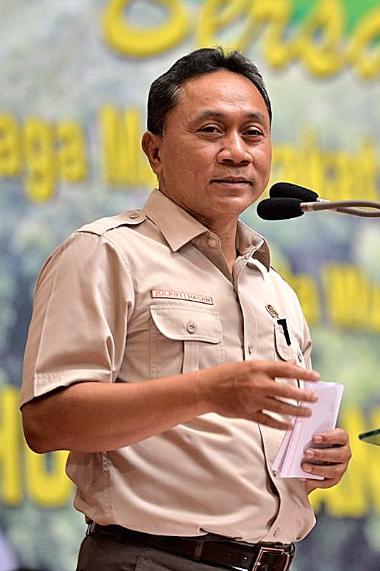 5 s/d 6 : Menteri Kehutanan Zulkifli Hasan memberikan arahan usai meninjau pabrik industri sengon PT. Dharma Satya Nusantara (PT. DSN) di Aula Pabrik.