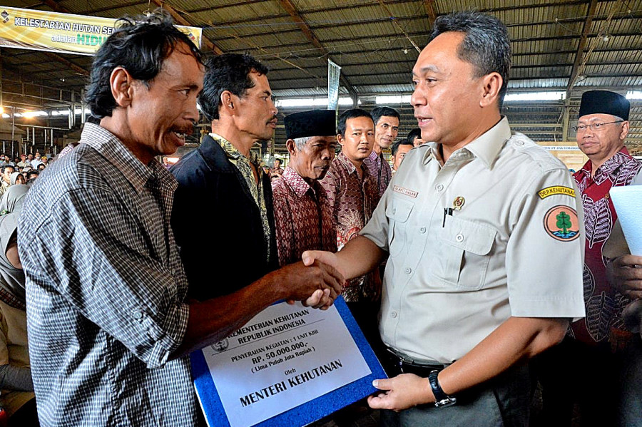 7 : Menteri Kehutanan Zulkifli Hasan secara simbolis menyerahkan bantuan KBR kepada petani rakyat di sela-sela acara kunjungan kerja peninjauan pabrik industri sengon PT. Dharma Satya Nusantara (PT. DSN) di Temanggung.
