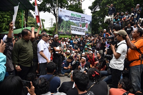 Sekitar 200 orang yang tergabung dalam Aliansi Cagar Alam Jawa Barat melakukan aksi damai di kantor KLHK, Rabu pagi (6/3/2019). Aksi damai ini merupakan respons masyarakat terhadap ditetapkannya Keputusan Menteri LHK Nomor: SK.25/MENLHK/SETJEN/PLA.2/1/2018 tanggal 10 Januari 2018 tentang Perubahan Fungsi dalam Fungsi Pokok Kawasan Hutan dari sebagian Cagar Alam Kamojang seluas