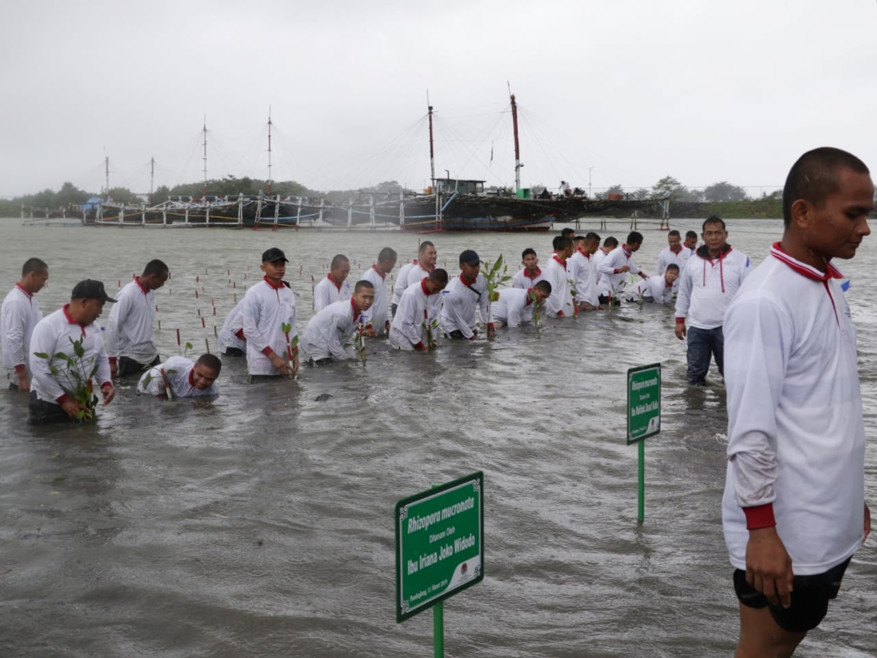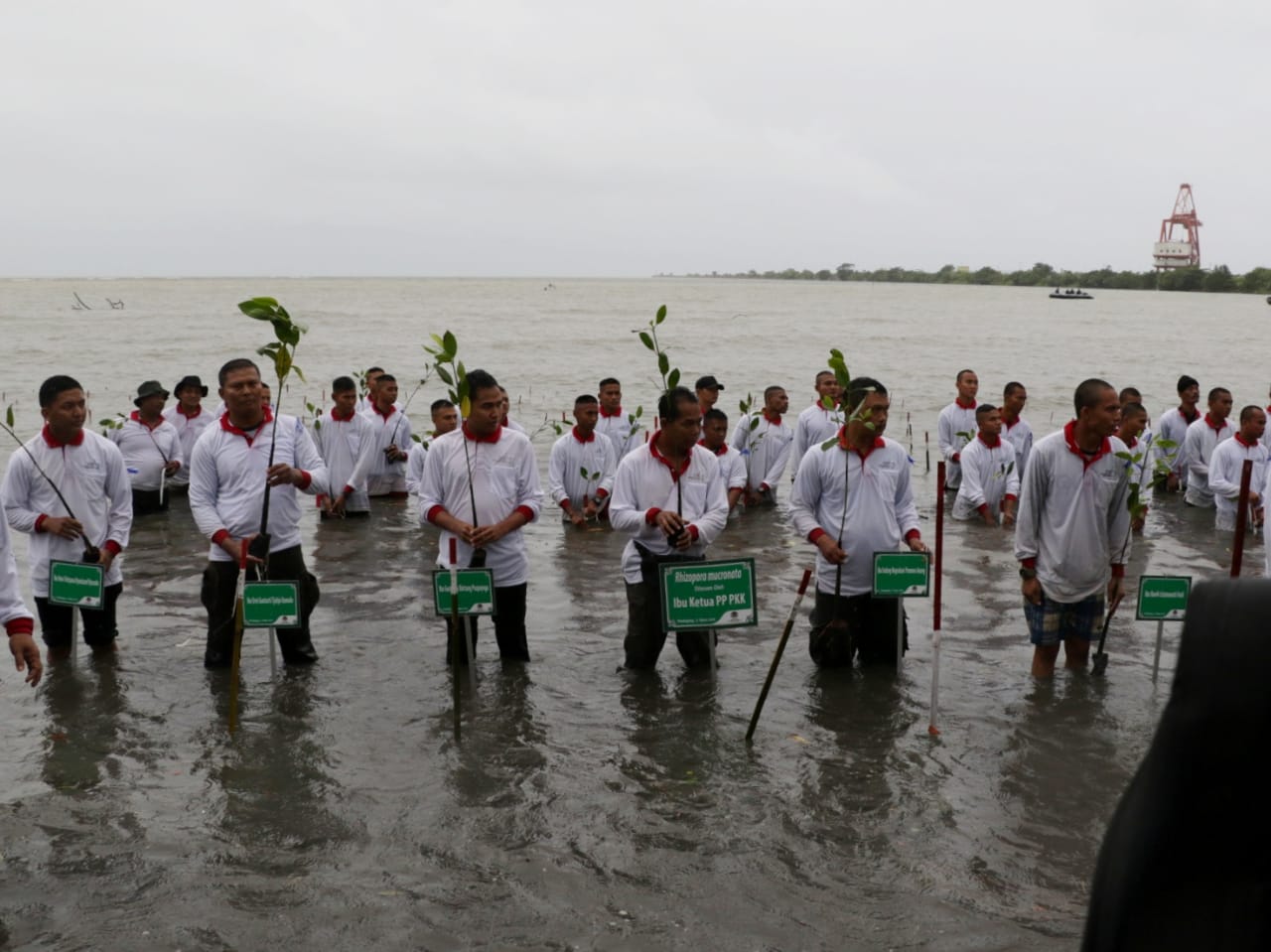 Dalam acara yang mengangkat tema Rehabilitasi Mangrove untuk Mitigasi Bencana dan Perubahan Iklim ini, selain di Labuan, kegiatan penanaman 1 juta mangrove serentak dilakukan di 10 Provinsi dengan total yang ditanam hari ini sekitar 53.000 batang. Ibu Iriana pun menyapa para peserta penanaman mangrove melalui teleconference yang ditampilkan di layar.
