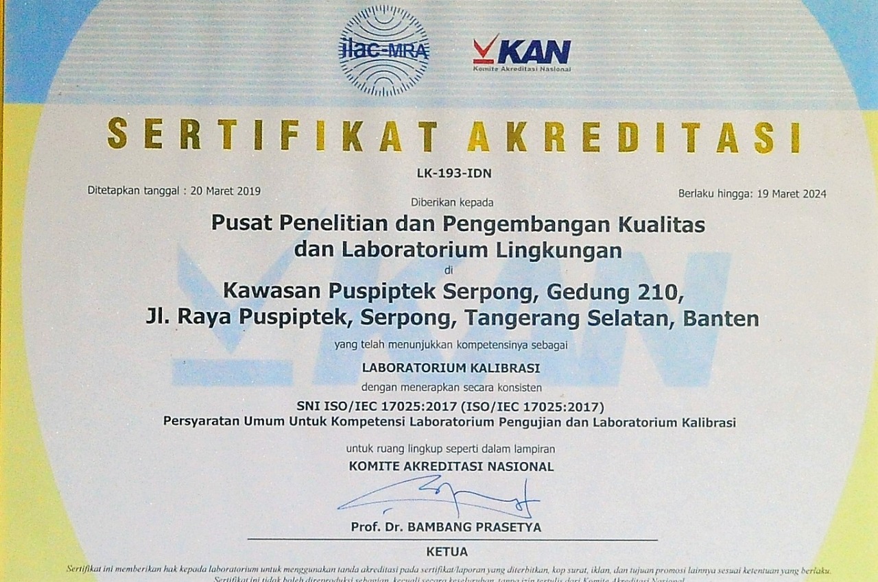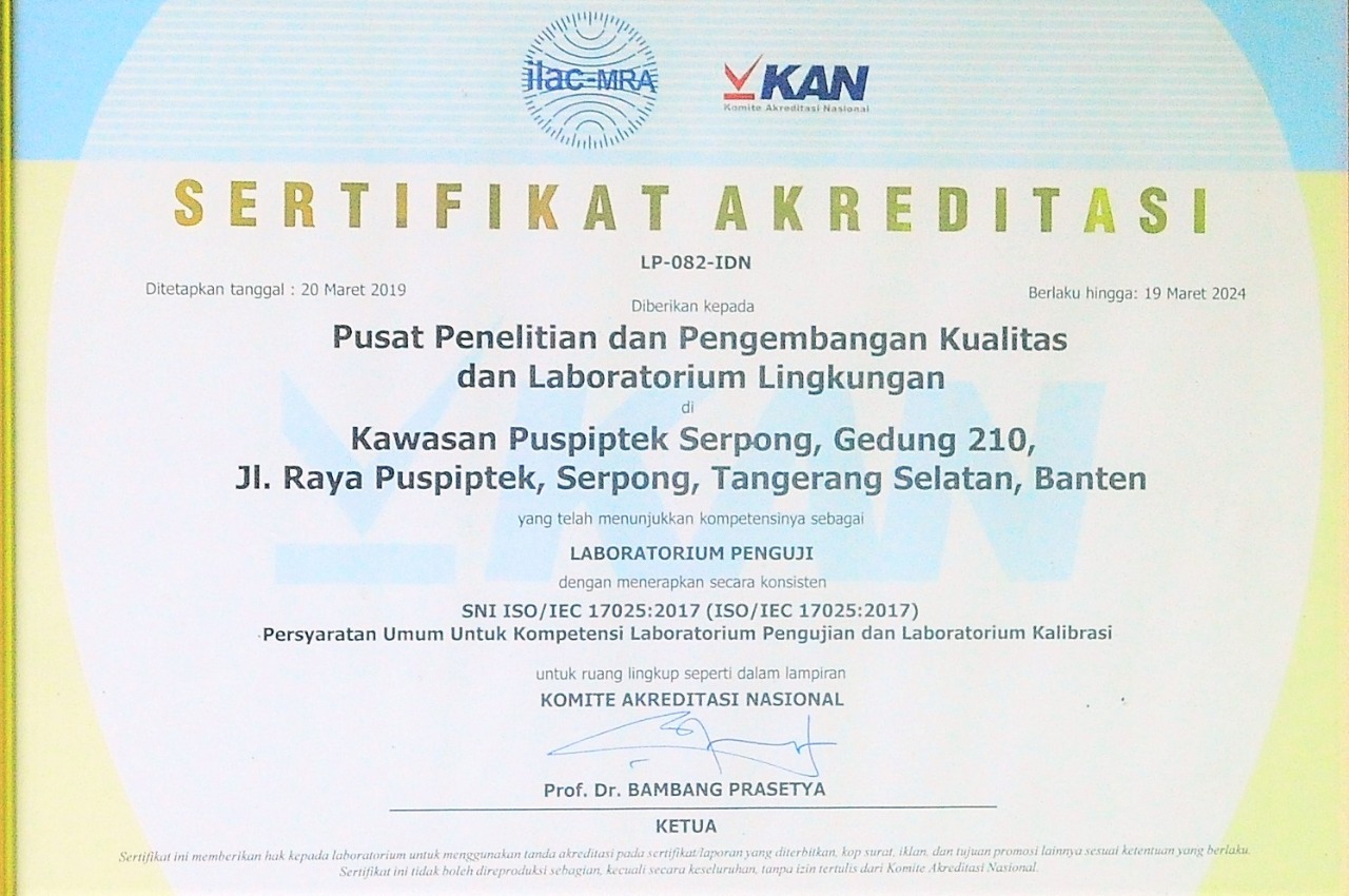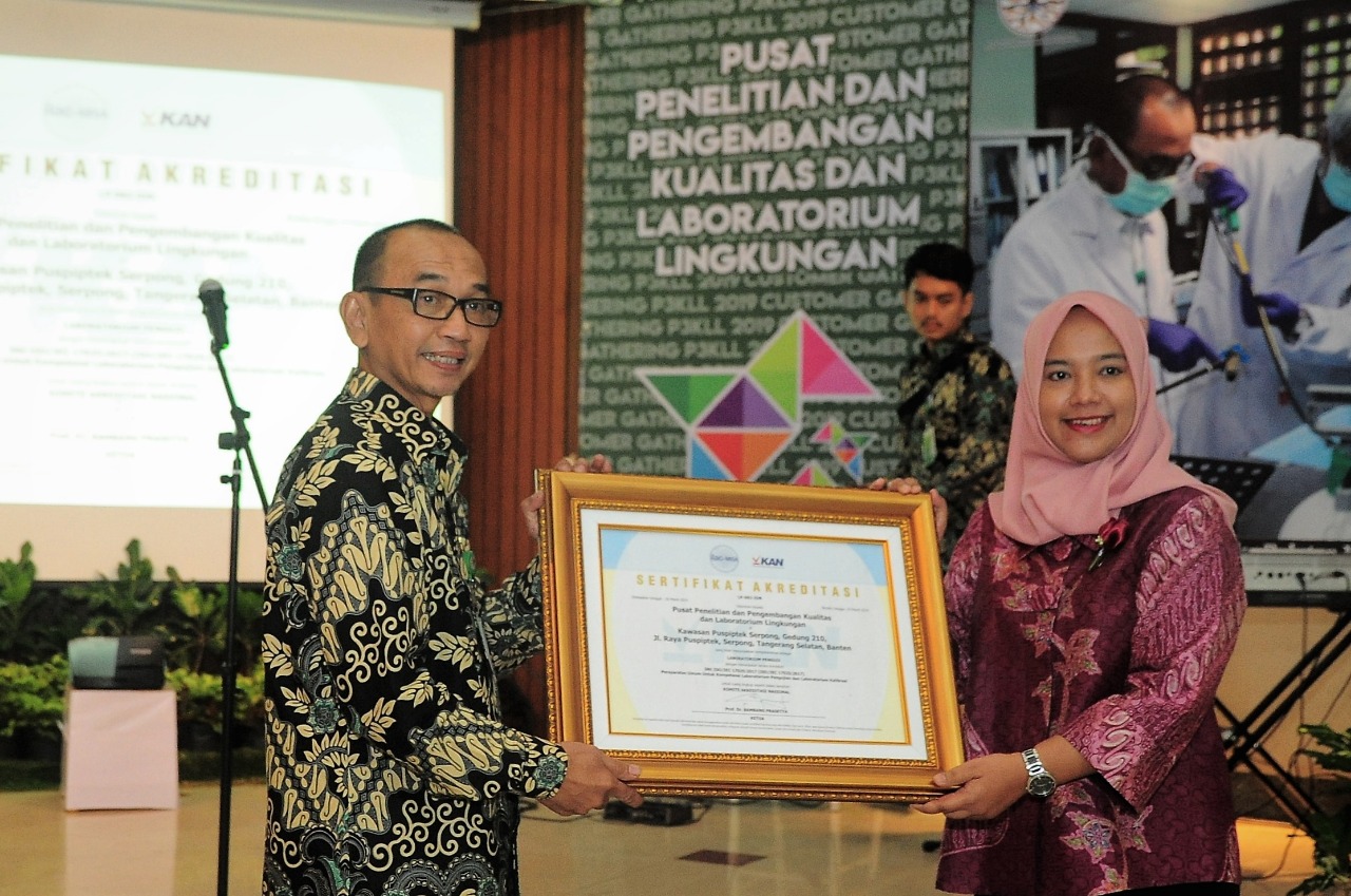 Pusat Penelitian dan Pengembangan Kualitas dan Laboratorium Lingkungan (P3KLL) KLHK memperoleh dua sertifikat akreditasi untuk laboratorium dari Komite Akreditasi Nasional (KAN), yaitu Laboratorium Pengujian dan Laboratorium Kalibrasi. Sertifikat tersebut diserahkan Direktur Akreditasi Laboratorium KAN Fajarina kepada Kepala P3KLL Herman Hermawan dalam acara Customer Gathering P3KLL yang digelar di Kantor P3KLL, Serpong, Rabu (24/04/2019).