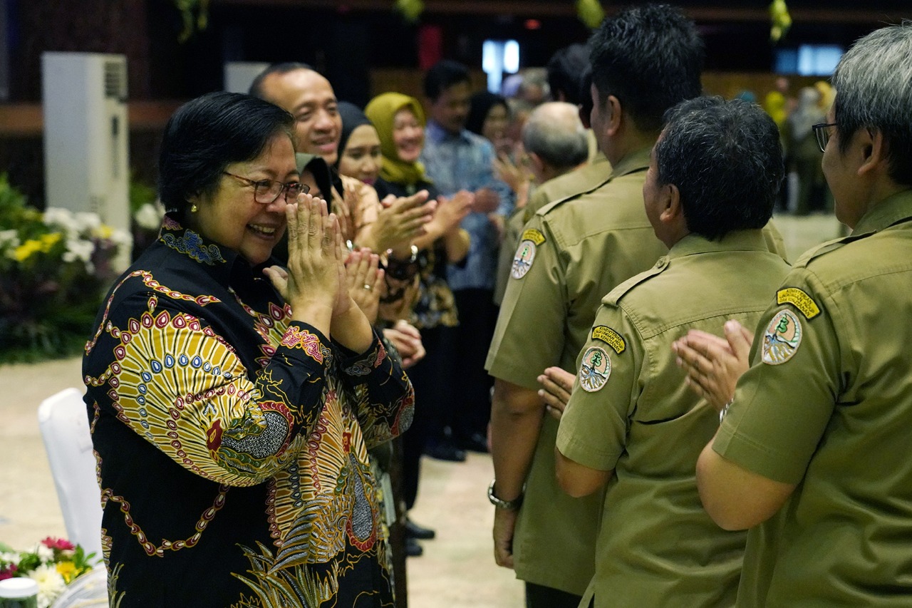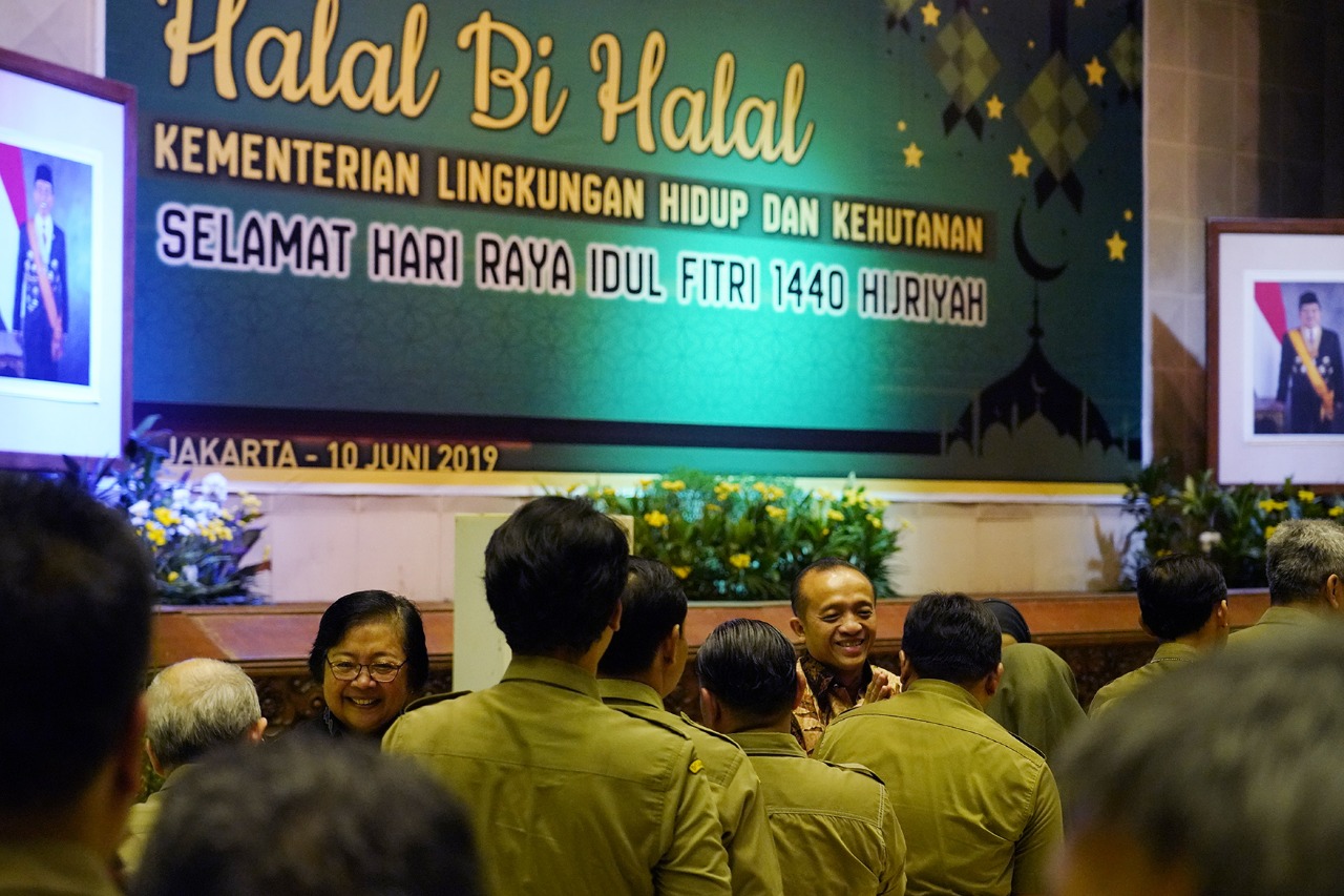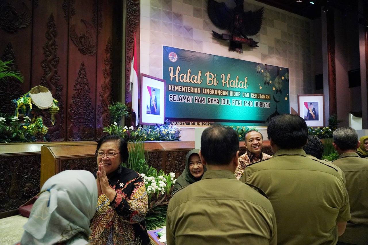 Menteri LHK Siti Nurbaya menggelar acara halal bihalal bersama segenap keluarga besar KLHK, di Auditorium Dr. Soedjarwo Gedung Manggala Wanabakti, Jakarta, (10/6). Menteri Siti didampingi oleh seluruh Pimpinan Tinggi Madya (Eselon I), Staf Khusus Menteri, Tenaga Ahli Menteri, Penasihat Senior Menteri, dan Pimpinan Tinggi Pratama (Eselon II). Acara yang dimulai sekitar pukul 08.30 WIB ini, selain dihadiri sekurangnya 4.000 Aparatur Sipil Negara (ASN) KLHK, juga dihadiri oleh mitra kerja, asosiasi dan kalangan media.