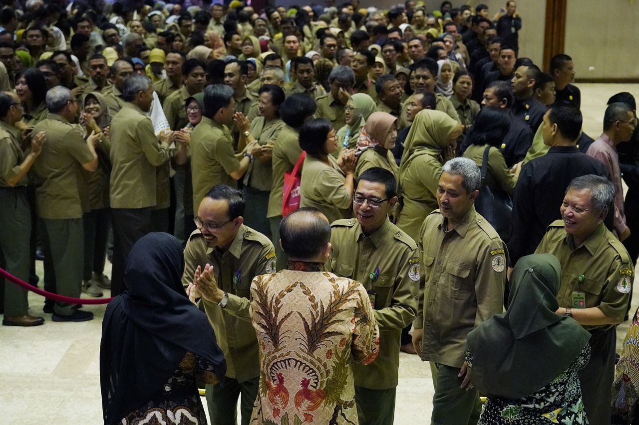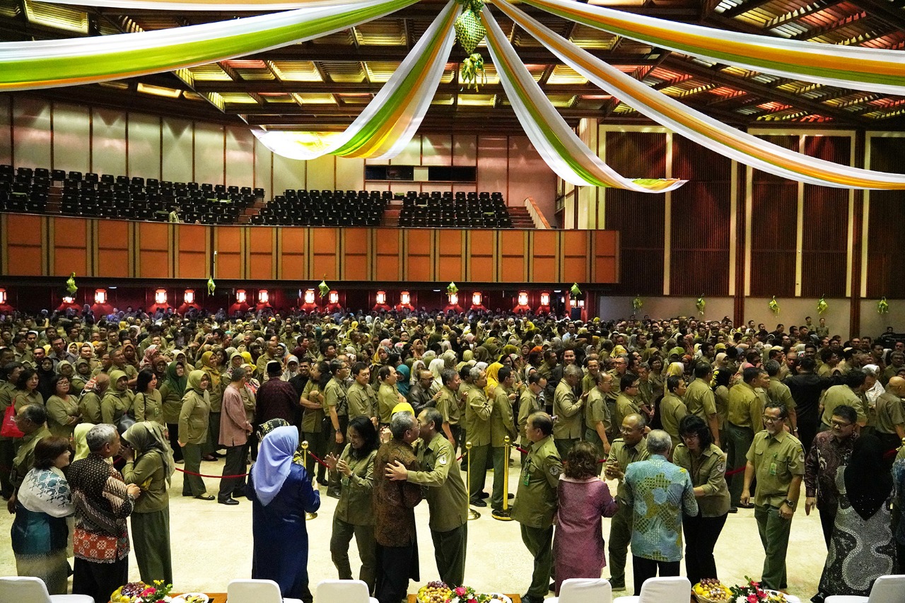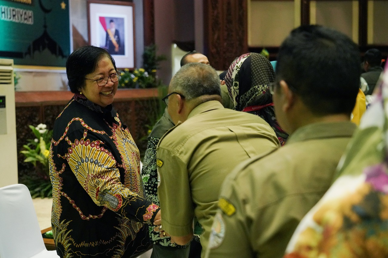 Menteri LHK Siti Nurbaya menggelar acara halal bihalal bersama segenap keluarga besar KLHK, di Auditorium Dr. Soedjarwo Gedung Manggala Wanabakti, Jakarta, (10/6). Menteri Siti didampingi oleh seluruh Pimpinan Tinggi Madya (Eselon I), Staf Khusus Menteri, Tenaga Ahli Menteri, Penasihat Senior Menteri, dan Pimpinan Tinggi Pratama (Eselon II). Acara yang dimulai sekitar pukul 08.30 WIB ini, selain dihadiri sekurangnya 4.000 Aparatur Sipil Negara (ASN) KLHK, juga dihadiri oleh mitra kerja, asosiasi dan kalangan media.