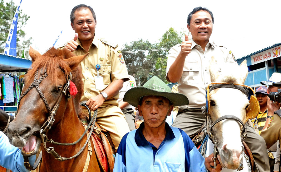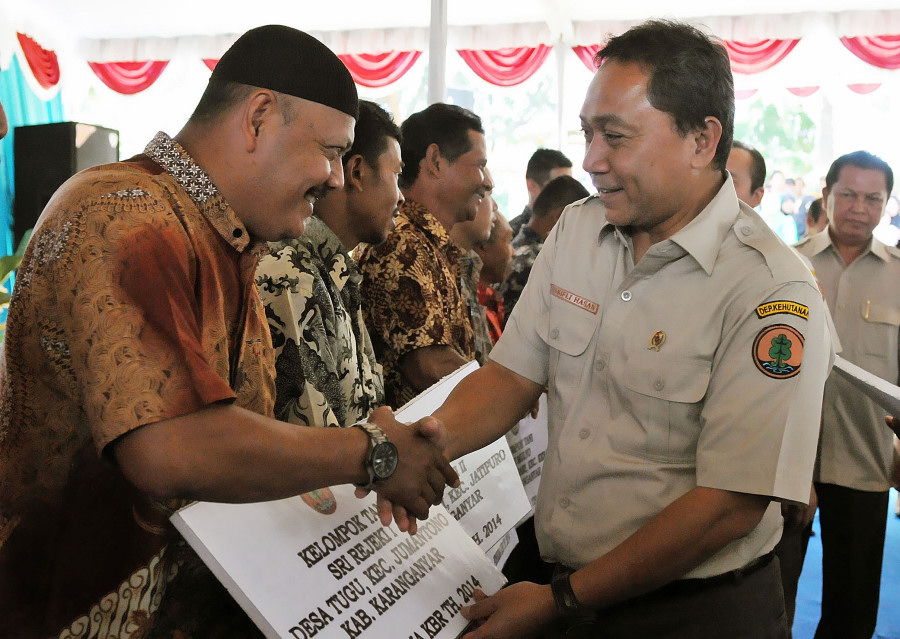 Pushumas Kemenhut, Karanganyar : Dalam Kunjungan kerjanya di Karanganyar Menteri Kehutanan RI Zulkifli Hasan didampingi oleh Dirjen BUK Bambang Hendroyono, Dirjen BPDASPS Hilman Nugroho, Dirjen PHKA (Plt) Sony Partono dan para pejabat lingkup Kementerian Kehutanan melakukan Temu Kader Konservasi Alam, Senin, (7/04) di Taman Wisata Alam Grojogan Sewu