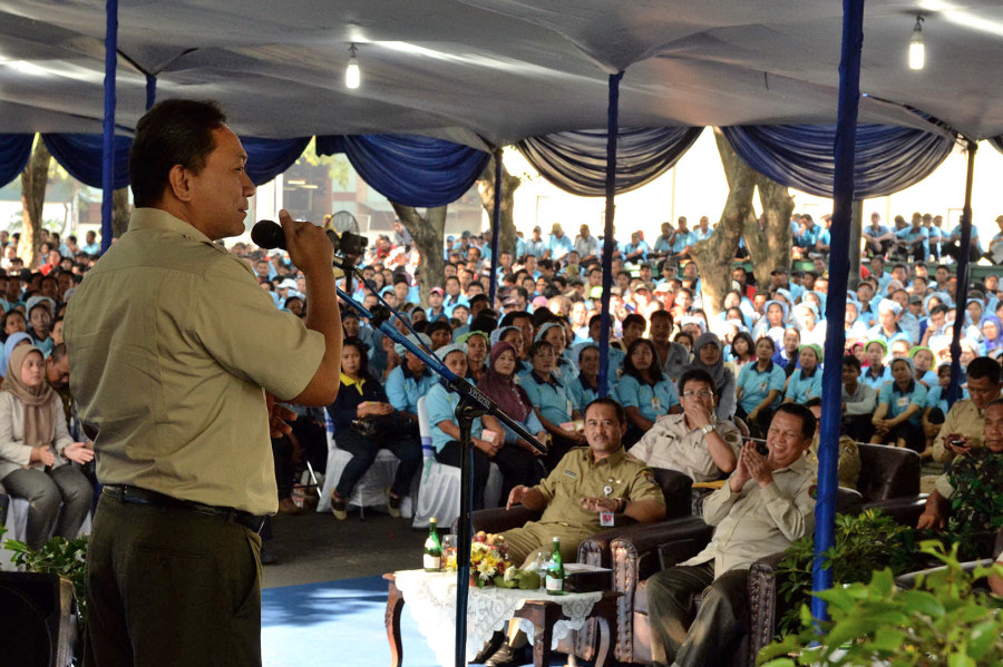 Foto 1 & 2 : Menteri Kehutanan Zulkifli Hasan sampaikan harapan agar kemajuan industri hutan tanaman ditularkan ke luar Pulau Jawa saat memberikan sambutan di hadapan ratusan karyawan PT. Kayu Lapis Indonesia di Kendal Provinsi Jawa Tengah, Senin (7/4)