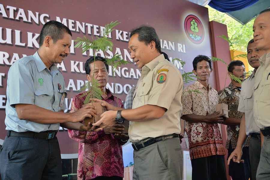 Foto 3 : Menteri Kehutanan Zulkifli Hasan secara simbolis menyerahkan bibit kepada perwakilan karyawan PT. Kayu Lapis Indonesia dan beberapa perwakilan kelompok tani hutan Kendal, Provinsi Jawa Tengah