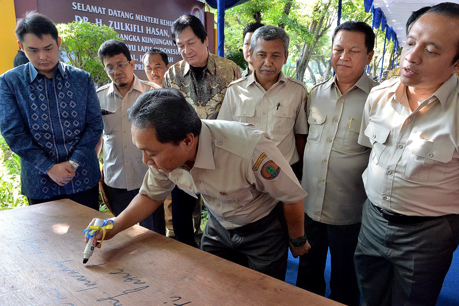 Foto 4: Menteri Kehutanan Zulkifli Hasan menuliskan pesan dan kesan kepada PT. Kayu Lapis Indonesia di sebuah papan kayu, dihadapan (kanan-ke-kiri) Dirjen BUK Bambang Hendroyono, Plt. Dirjen PHKA Sonny Partono, dan Dirjen BPDAS-PS Hilman Nugroho serta jajaran direktur PT. KLI