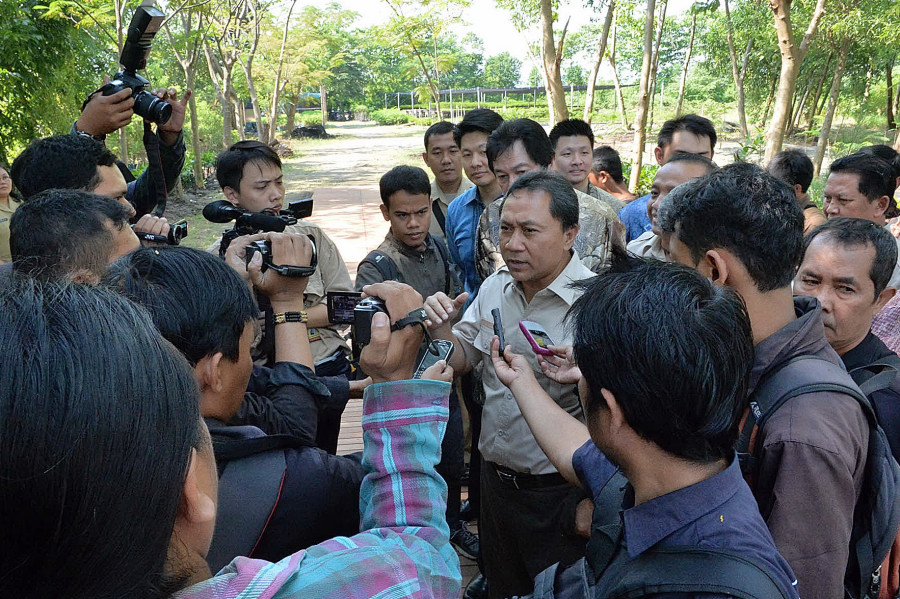 Foto 6 : Menteri Kehutanan Zulkifli Hasan melakukan wawancara dengan media saat melakukan kunjungan kerja ke PT. Kayu Lapis Indonesia di Kendal Provinsi Jawa Tengah, Senin (7/4)
