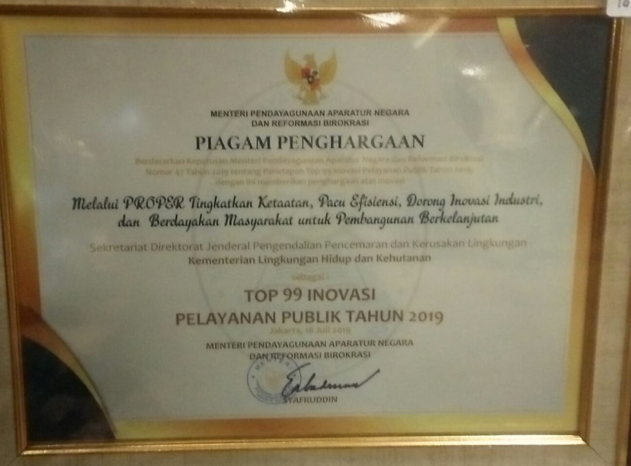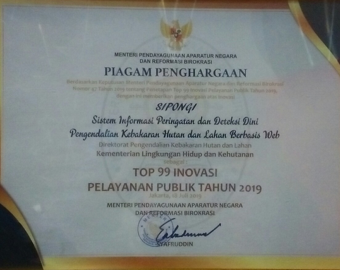 Jakarta, Kementerian Lingkungan Hidup dan Kehutanan (KLHK), Jumat, 19 Juli 2019. SVLK, SIPONGI dan PROPER, tiga inovasi pelayanan publik KLHK meraih penghargaan Inovasi Pelayanan Publik Tahun 2019 dari Kementerian Pendayagunaan Aparatur Negara Reformasi Birokrasi (PAN-RB). Penyerahan penghargaan tersebut dilakukan pada acara Awarding Top 99 Inovasi Pelayanan Publik tahun 2019 yang diselenggarakan di Hotel Gumaya Tower, Semarang, Jawa Tengah, pada Kamis malam (18/07/2019).
