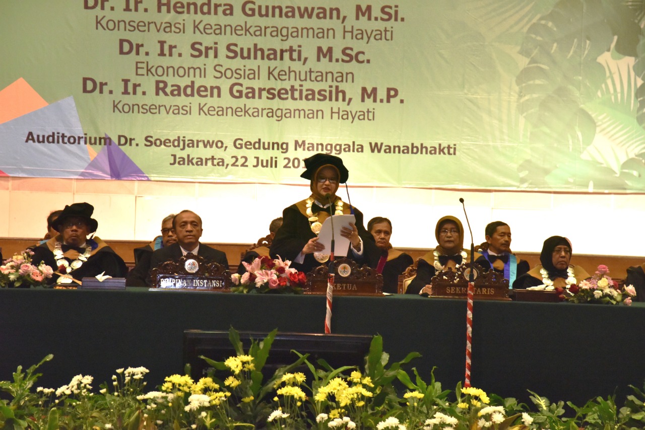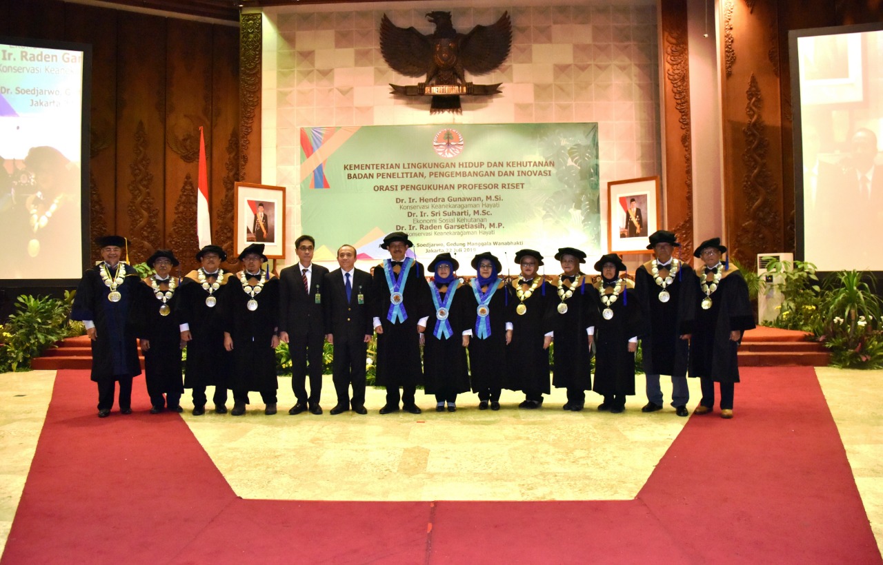 Jakarta, Kementerian Lingkungan Hidup dan Kehutanan (KLHK), Senin, 22 Juli 2019. Tiga Peneliti dari Badan Penelitian, Pengembangan dan Inovasi (BLI) KLHK dikukuhkan sebagai Profesor Riset baru. Mereka adalah Hendra Gunawan dan Raden Garsetiasih dari bidang konservasi keanekaragaman hayati, dan Sri Suharti dari bidang ekonomi sosial kehutanan. Pengukuhan Profesor Riset ini dilakukan di Auditorium Soedjarwo, Gedung Manggala Wanabakti, Jakarta, (22/07/2019).