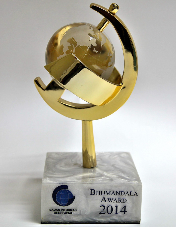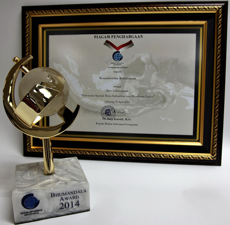 Pushumas Kemenhut, Cibinong : Dalam rangka Pekan Geospasial Nasional Tahun 2014 serta memperingati Hari Bumi, 22 April yang mengangkat tema "Selamatkan Bumi dengan Informasi Geospasial" , Badan Informasi Geospasial (BIG) menganugrahkan kepada Kementerian Kehutanan penghargaan Best Achievement "Indonesia-Spatial Data Infrastructure Readiness Index" Bhumandala Award 2014, Senin (21/4) di Cibinong.