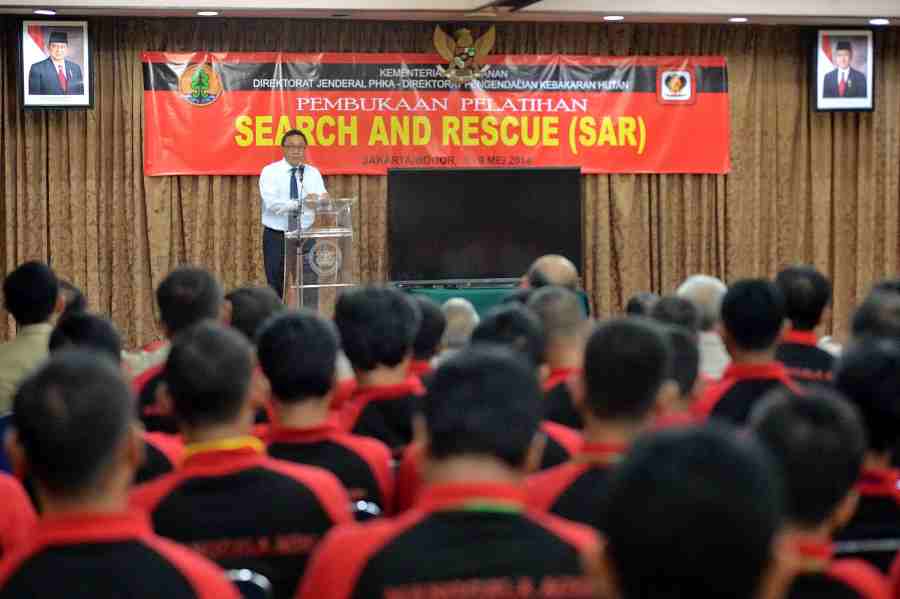 Foto 4 : Menteri Kehutanan secara simbolis membuka Pelatihan SAR bagi Anggota Manggala Agni Kementerian Kehutanan. Peserta pelatihan sebanyak 35 orang dan akan berlangsung sampai dengan tanggal 9 Mei 2014 di Jakarta dan Bogor.