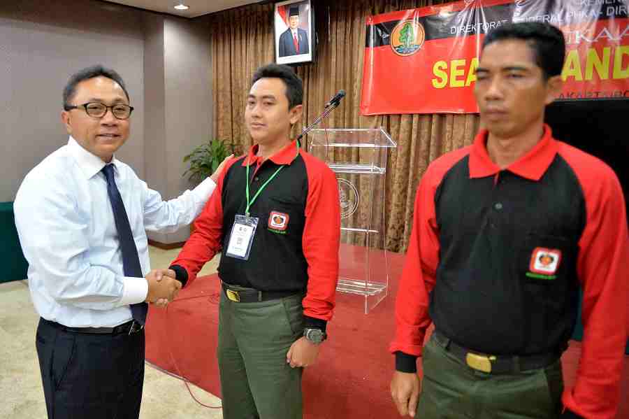 Foto 1 : Menteri Kehutanan Zulkifli Hasan (kiri) menyerahkan SK Pembentukan Tim Rescue Kementerian Kehutanan kepada Plt. Direktur Jenderal Perlindungan Hutan dan Konservasi Alam (PHKA) Sonny Partono saat Pembukaan Pelatihan SAR bagi Anggota Manggala Agni, Senin (5/5) di Jakarta.