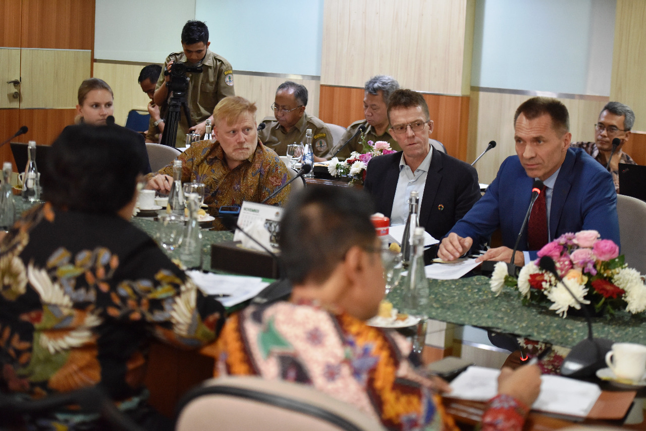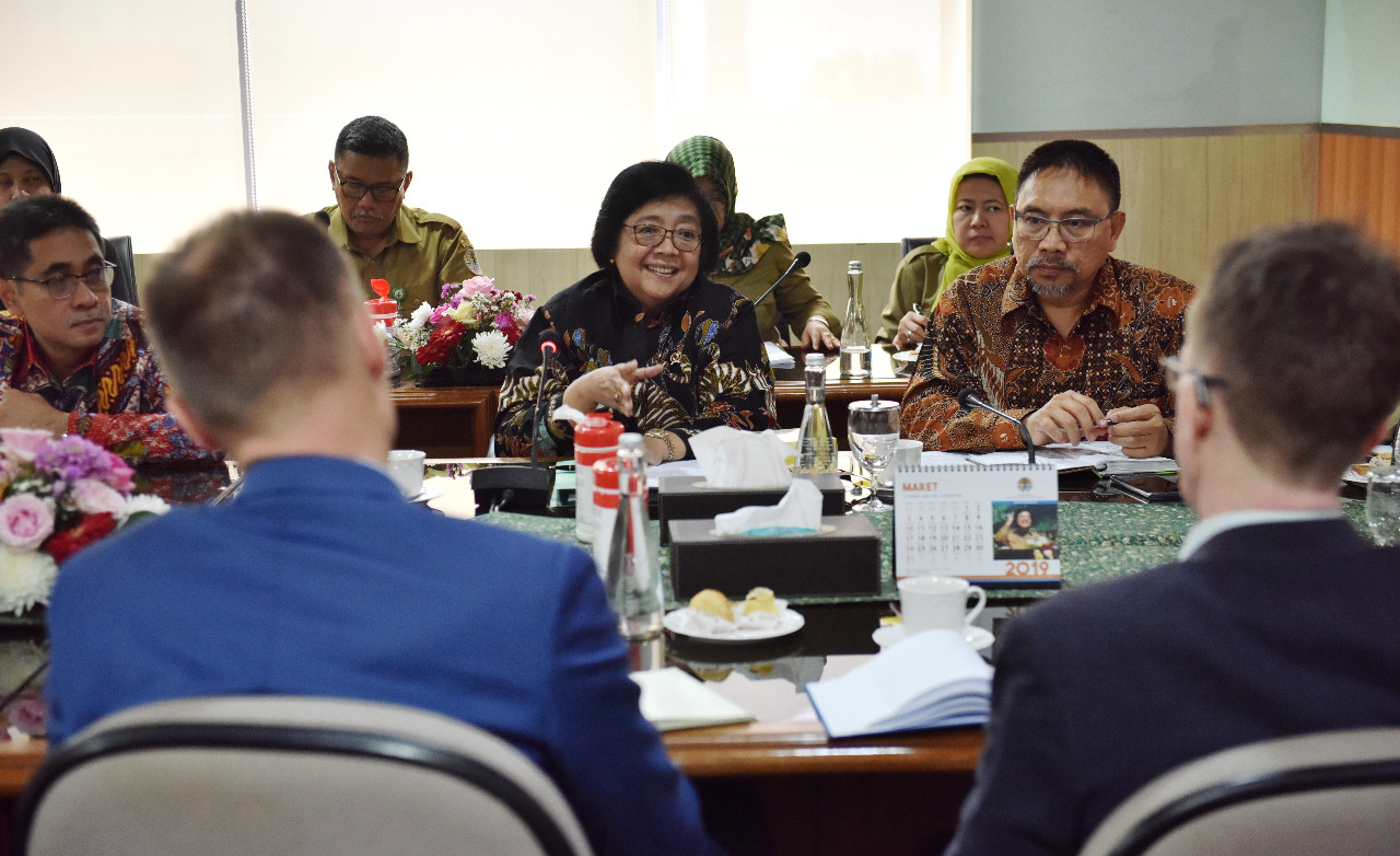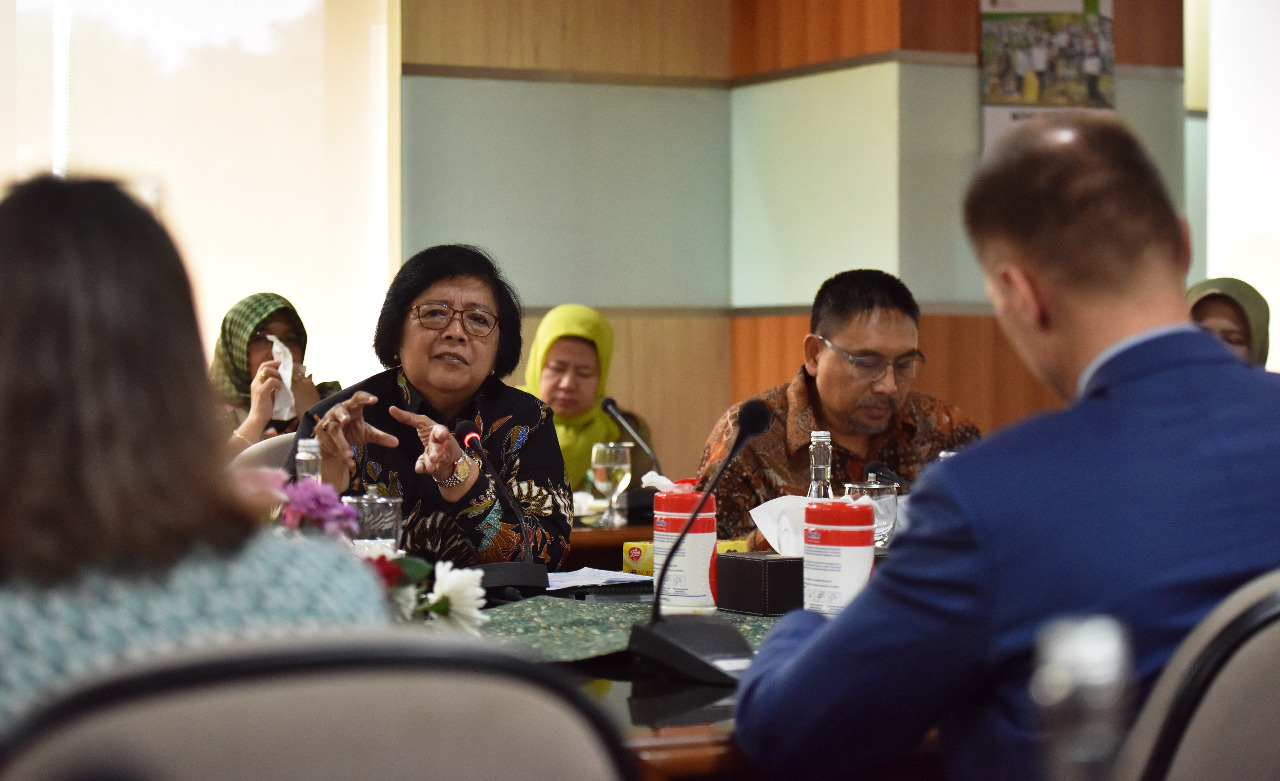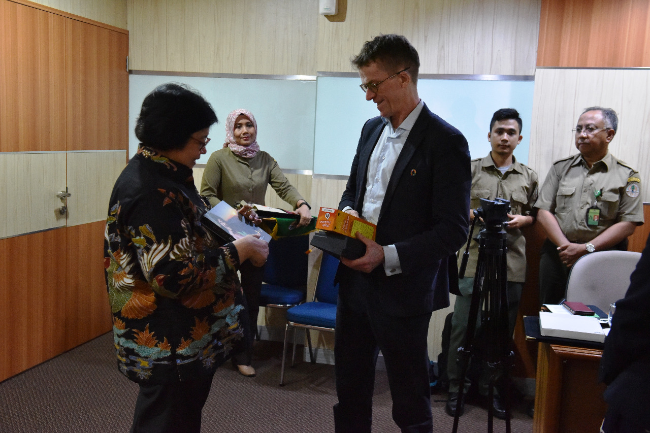 Menteri LHK Siti Nurbaya menerima kunjungan Utusan Khusus Menteri Iklim dan Lingkungan Hidup Norway, Per Federick Ilsaas Pharo yang didampingi Duta Besar Kerajaan Norway Vegard Kaale di Operasional Room Kementerian LHK (18/11) Jakarta.