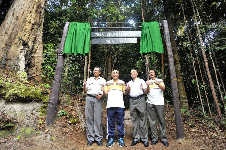 Pushumas Kemenhut, Kutai Kertanegara : Menteri Kehutanan Zulkifli Hasan meniti Canopy Bridge pada ketinggian 30 meter dari permukaan tanah sepanjang 64 meter yang terhubung dengan pohon bangkirai yang terdiri dari 4 lintasan dari satu pohon bangkirai ke pohon bangkirai lainnya., Selasa (20/8) di kawasan Wisata Alam Bukit Bangkirai Kalimantan Timur yang dikelola PT. Inhutani I.