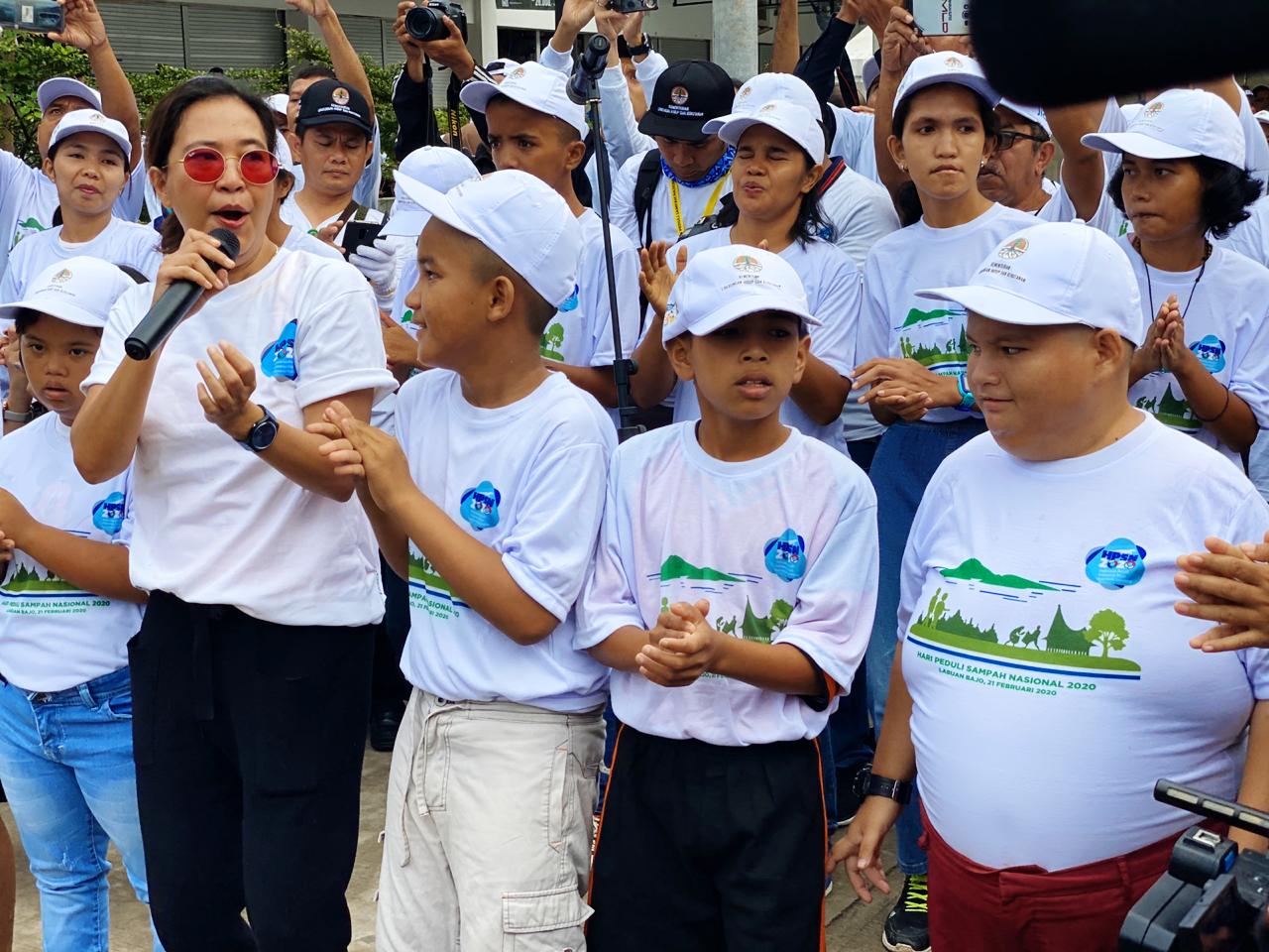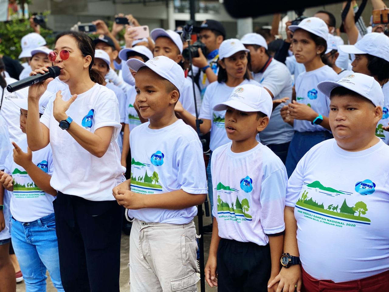 Didampingi penyanyi yang juga aktivis lingkungan Oppie Andaresta, puluhan anak-anak Sekolah Luar Biasa (SLB) Labuan Bajo menyanyikan lagu yang berisi ajakan peduli sampah.
