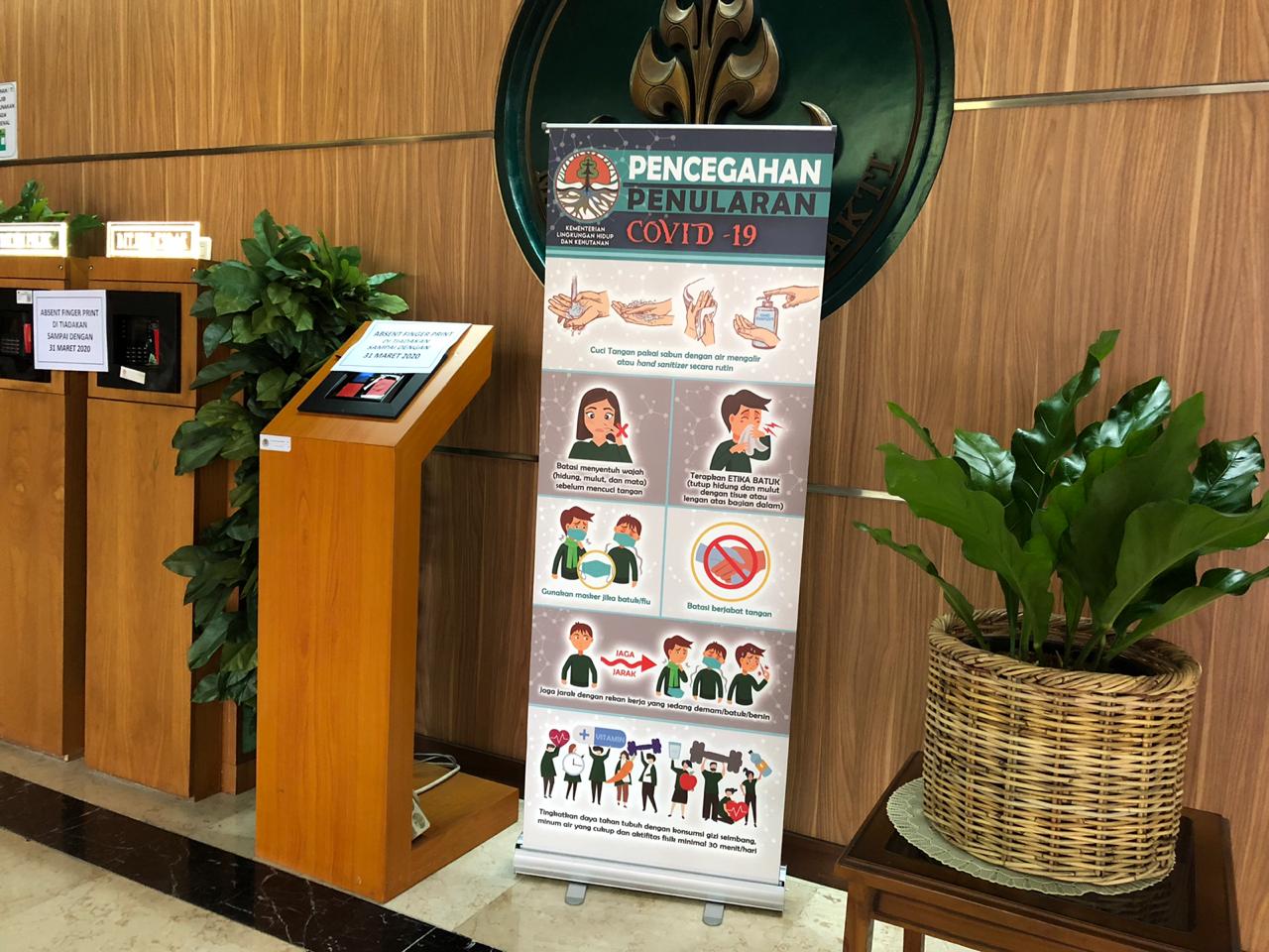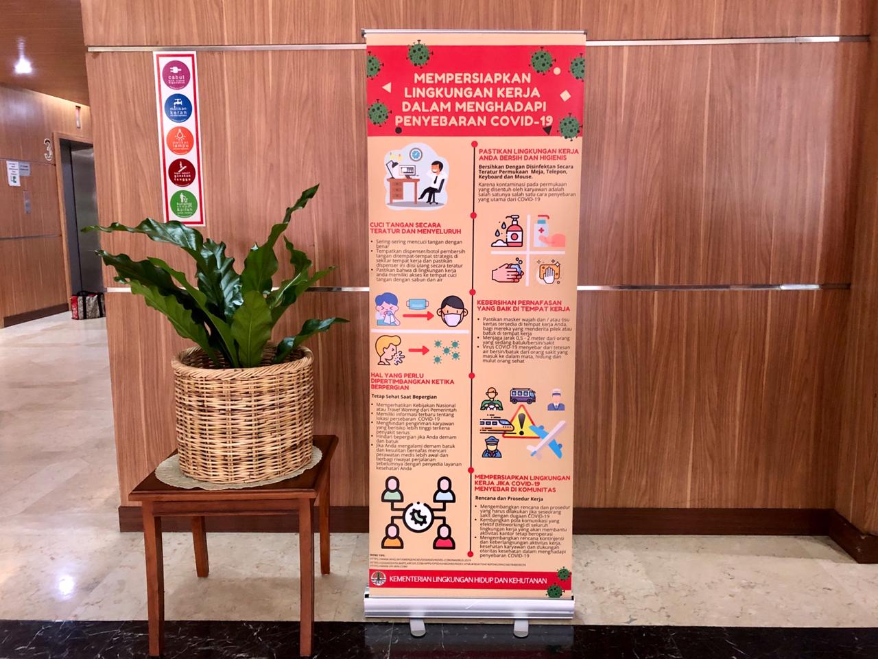 Semua daerah di Indonesia meningkatkan kewaspadaan terhadap penyebaran Corona Virus Disease 2019 (Covid-19), termasuk di berbagai kantor kementerian/lembaga. Pada Kementerian Lingkungan Hidup dan Kehutanan (KLHK), pelaksanaan kerja harian tetap dilakukan sebagaimana biasa.