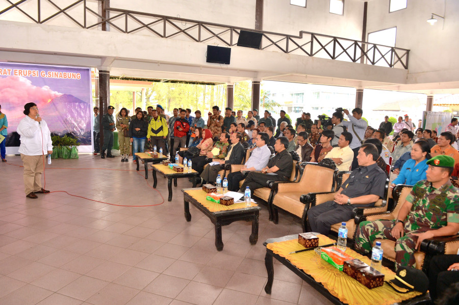 Foto 2-3 : Paparan rencana teknis pembukaan areal hutan untuk relokasi pengungsian korban erupsi Gunung Sinabung oleh Menteri Lingkungan Hidup dan Kehutanan Siti Nurbaya di Kantor Bupati Tanah Karo.