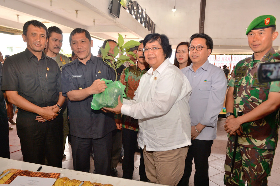 Foto 4 : Menteri LHK Siti Nurbaya secara simbolis menyerahkan bantuan kepada Plt. Bupati Tanah Karo Terkelin Brahmana berupa pohon alpukat, durian dan jambu sebanyak 3.000 batang.