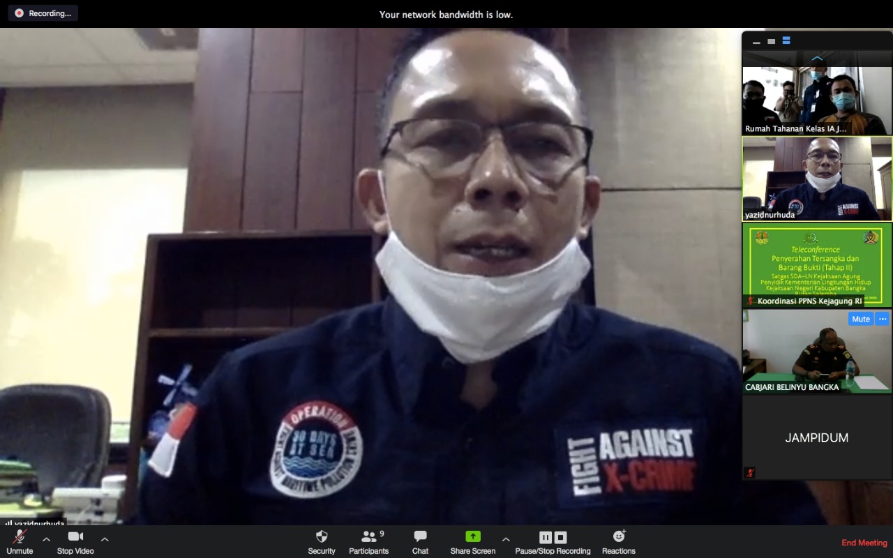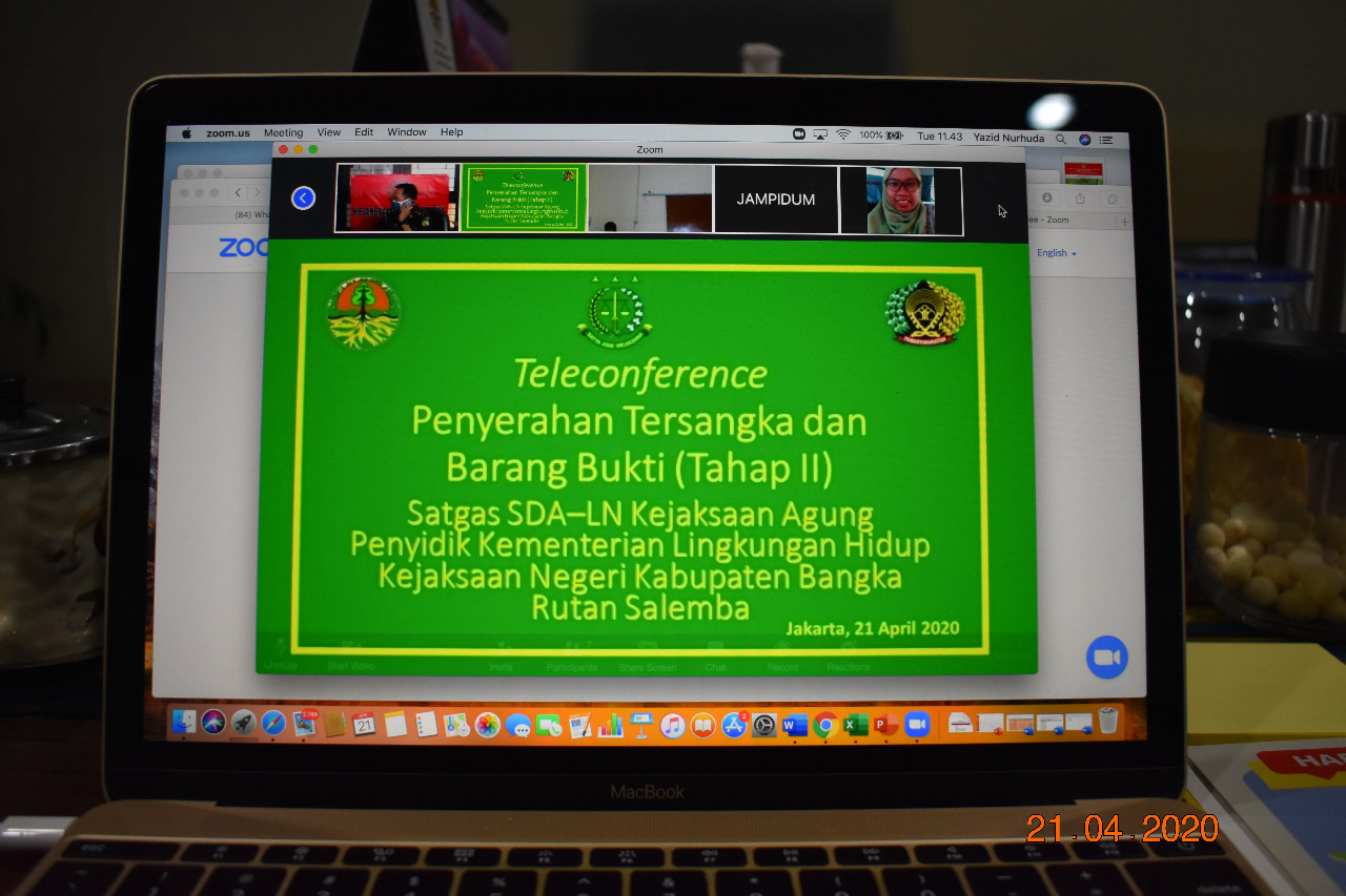 Di tengah kondisi pandemi Covid19 penyerahan tersangka dan barang bukti dilakukan secara online. Penyerahan secara online dihadiri oleh Kepala Satuan Tugas SDA Kejaksaan Agung RI di Kantor Kejaksaan Agung Jakarta, Kepala Kejaksaan Negeri Bangka di Kantor Kejari Bangka, dan Pengacara Sdr. H alias AN di Kantor Pos Gakum KLHK di Bangka, sedangkan tersangka H alias AN berada Rutan Kelas 1 Jakarta Pusat di Salemba. Penyerahan tersangka dan barang bukti kasus dipimpin langsung oleh Direktur Penegakan Hukum Pidana di Kantor Gakkum KLHK, Yazid Nurhuda, di Jakarta, (21/4).