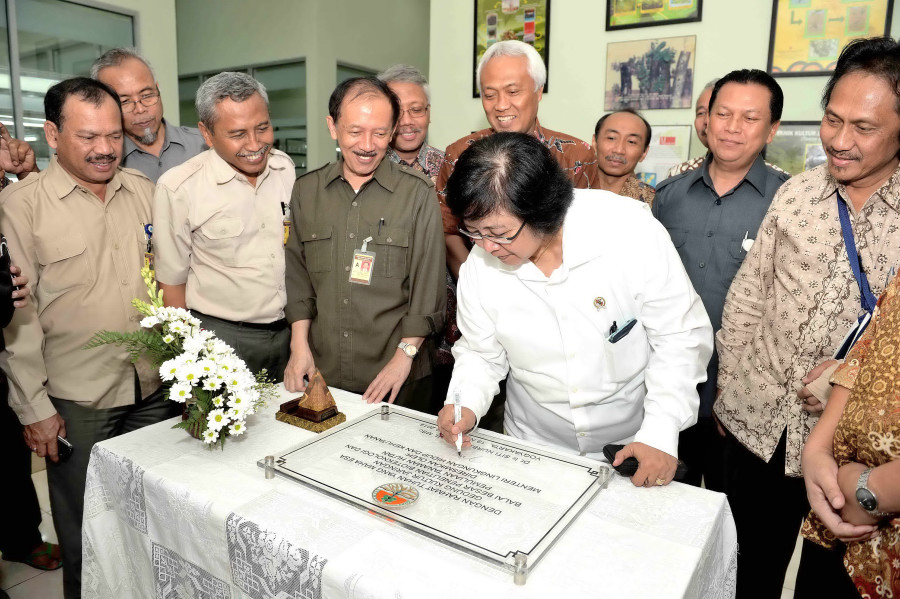 2. Menteri Lingkungan Hidup dan Kehutanan, Siti Nurbaya menadatangani plakat tanda peresmian Gedung Laboratrium Kultur Jaringan di Balai Penelitian Bioteknologi dan Pemuliaan Tanaman Hutan Yogyakarta.