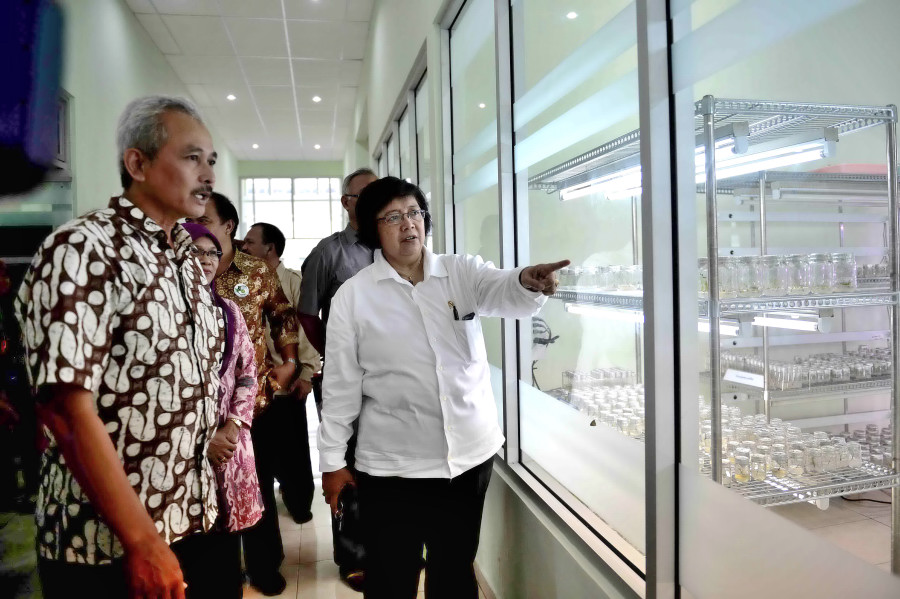 1. Menteri Lingkungan Hidup dan Kehutanan, Siti Nurbaya berkeliling Gedung Laboratorium Kultur Jaringan didampingi oleh Sekreteris Jenderal Kementerian Kehutanan, Hadi Daryanto dan Kepala Badan Litbang Kehutanan, San Afri Awang di Yogyakarta (19/11)