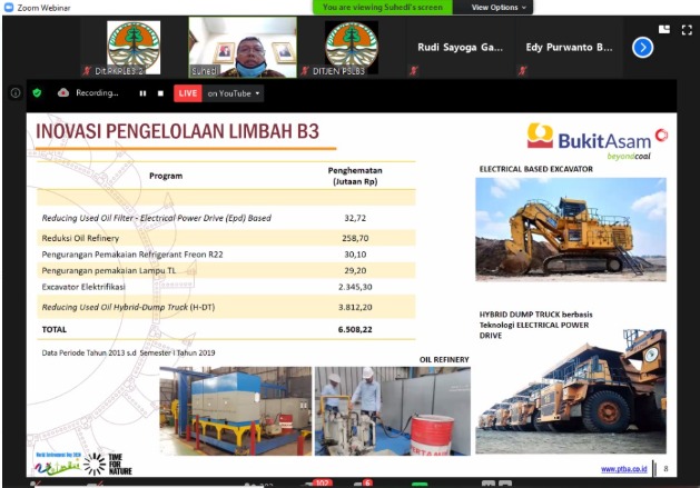 Direktur Jenderal PSLB3, KLHK, Rosa Vivien Ratnawati memimpin langsung kegiatan webinar ini. Dalam sambutannya, Vivien menyampaikan bahwa Pemerintah mendorong industri termasuk pertambangan mineral dan batubara untuk memanfaatkan limbah B3 yang dihasilkan sebagai model Circular Economy. Menurut Vivien, limbah B3 bukan sesuatu hal yang menghambat investasi dan tidak sekedar dimusnahkan di insinerator atau ditimbun di landfill, namun sangat diharapkan untuk dimanfaatkan dan menghasilkan sesuatu yang berguna.